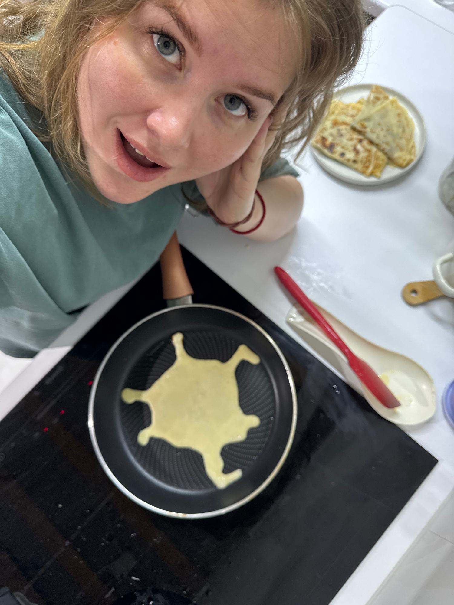 A selfie taken from an overhead perspective shows a woman with fair skin and blonde hair, wearing a green top, with a plate of what appear to be cooked crepes or pancakes in the upper left. To the rig…read more