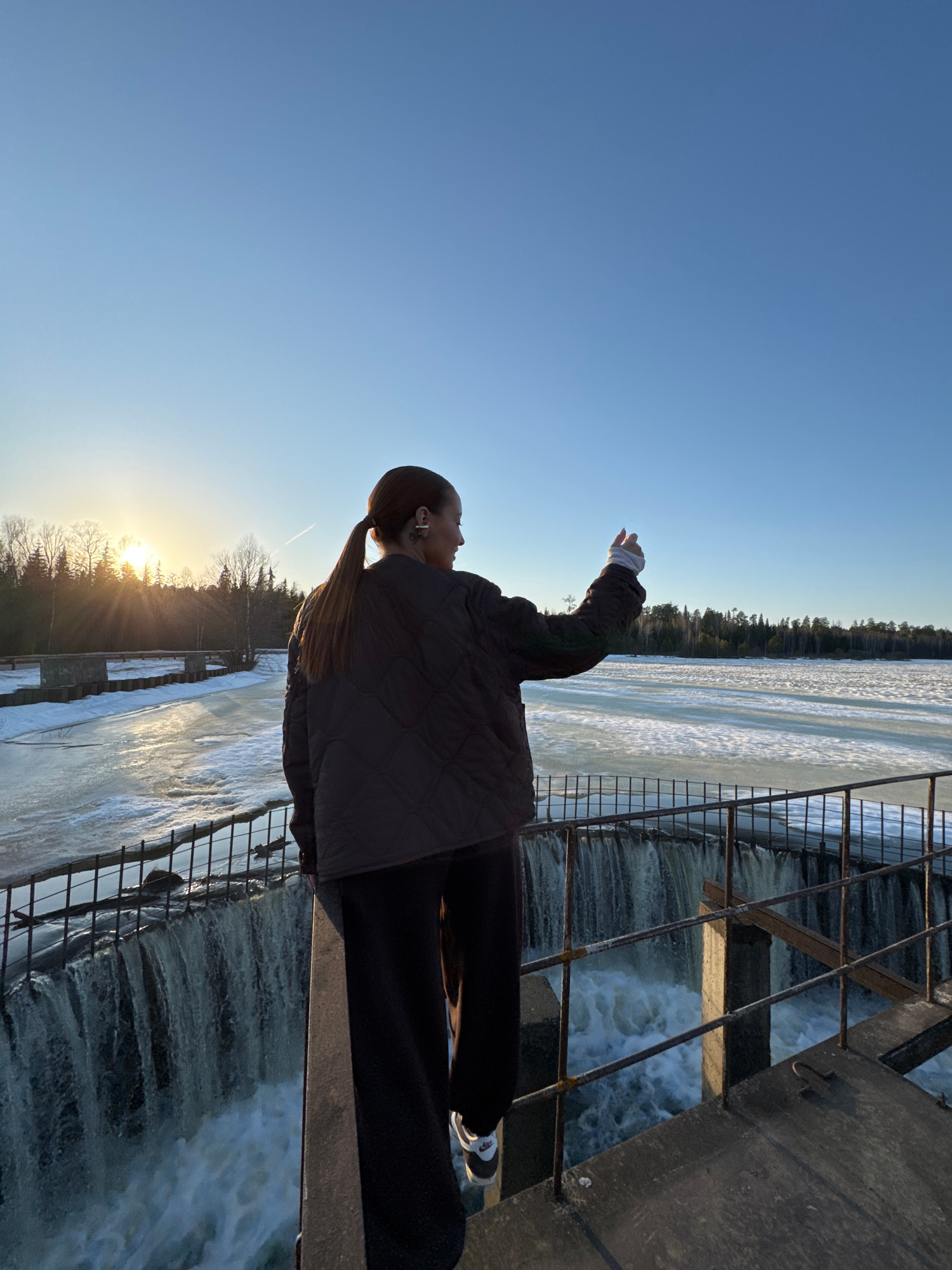 A woman stands on a concrete structure overlooking what appears to be a river or body of water with a dam or weir. She is wearing dark clothing and a jacket, and her hair is pulled back in a ponytail.…read more