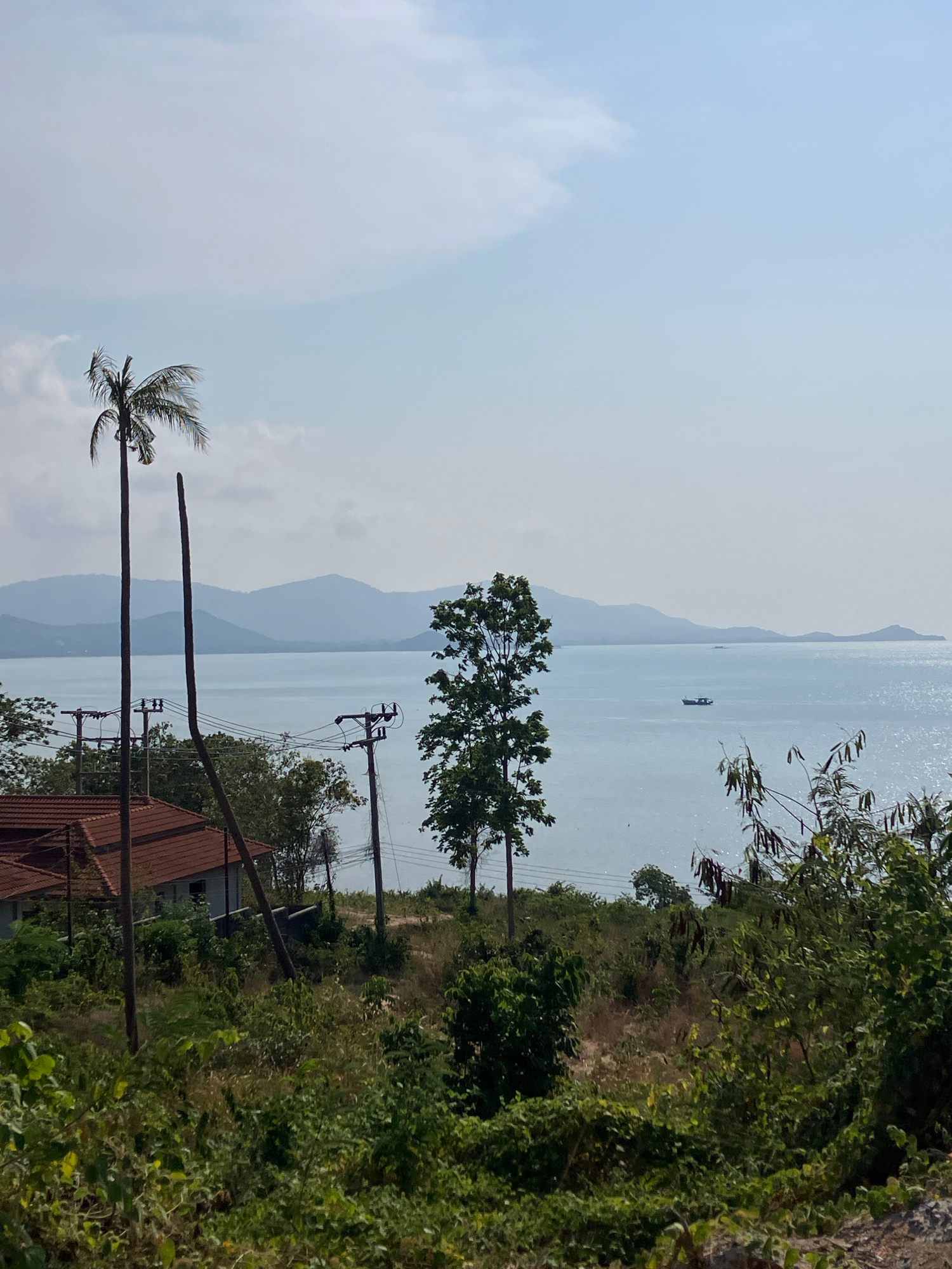 The scene is set in Baan Bo Phut, Thailand, featuring a body of water with a boat. A mountainous landscape can be seen on the other side of the water. There is lush vegetation in the foreground, withβ¦read more