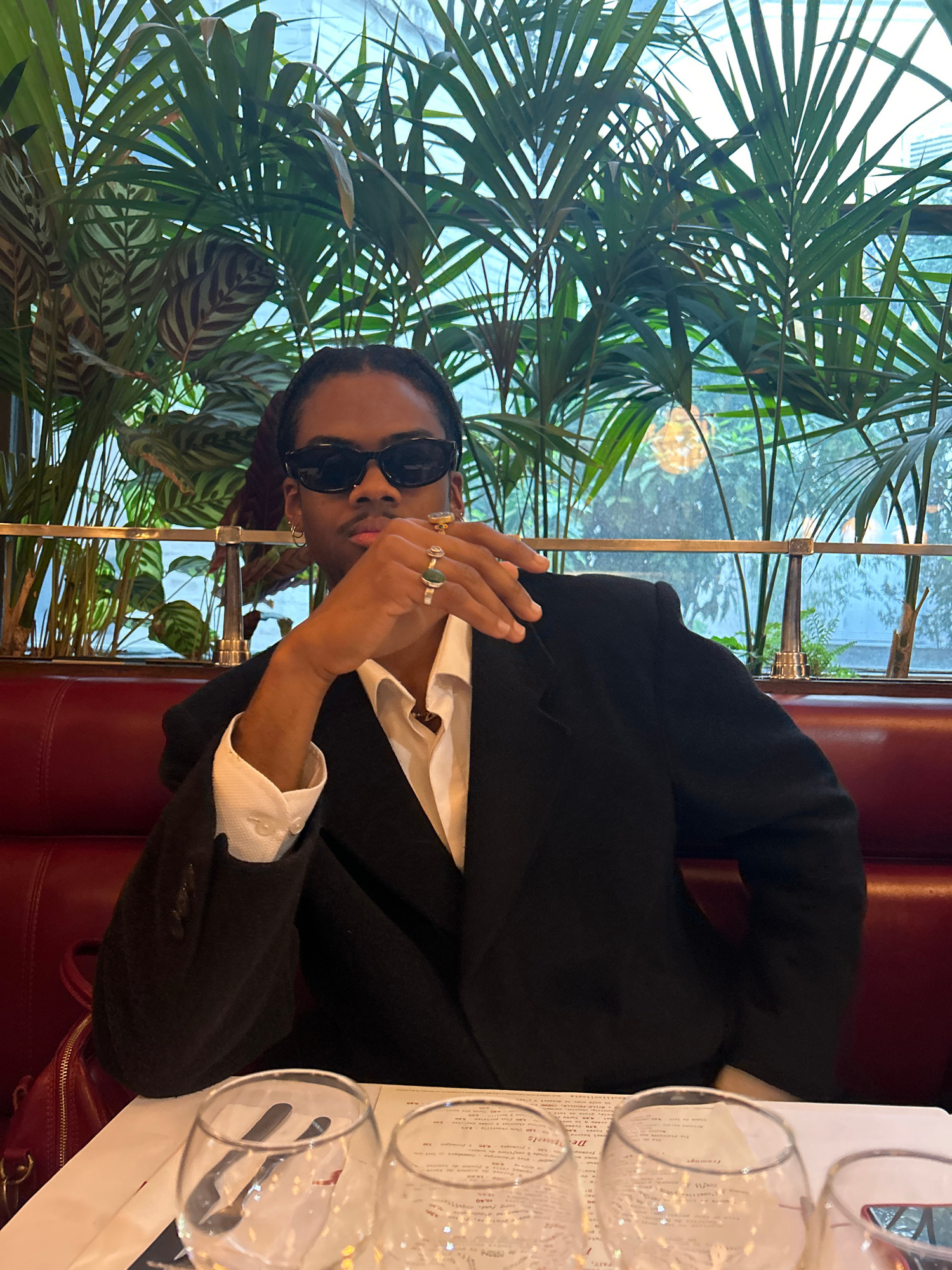 A person in sunglasses and a black suit sits at a table in what appears to be a restaurant, identifiable by the menu and wine glasses. The background shows a window with a view obscured by lush green…read more