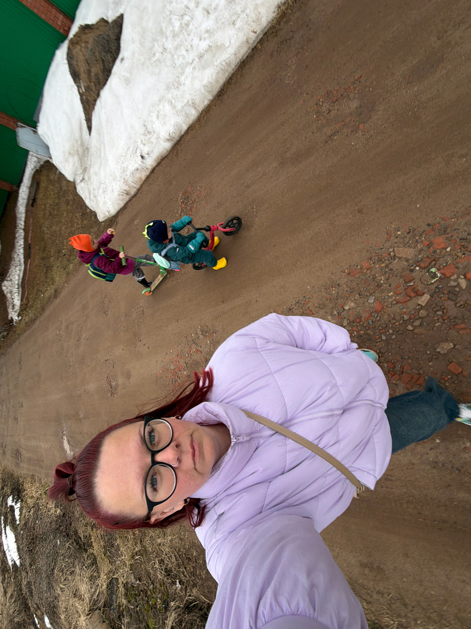 The image is an angled, downward selfie taken by a woman wearing glasses and a light purple puffer jacket. She has red hair pulled back in a bun and is looking at the camera. Below her are two children on a dirt road, one on a scooter and the other on a balance bike. In the bottom left corner is a patch of snow next to a green-roofed structure. The location is identified as Chaikovsky, Russia, based on the file properties. | Open Wire