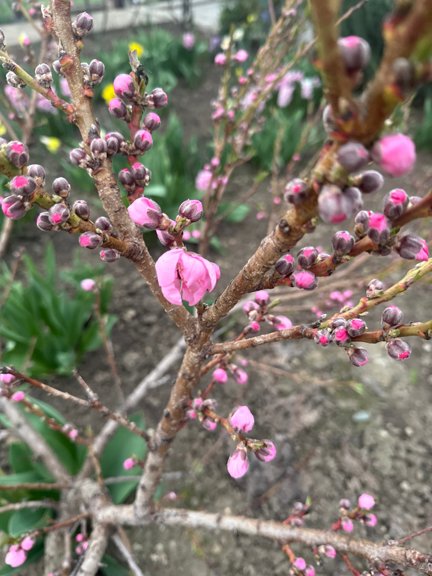 The image shows a close-up view of a blossoming tree, likely a peach or similar fruit tree, in the city of Maykop, Russia. The branches are brown and textured, covered in numerous pink flower buds and…read more