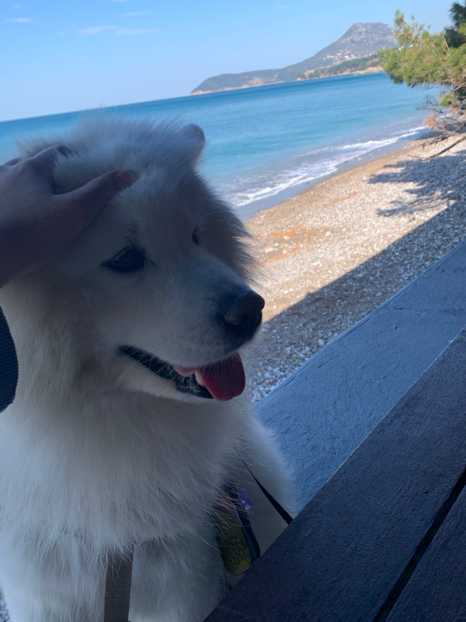 A photograph taken at a beach in Bar, Montenegro, shows a fluffy white dog, likely a Samoyed, in the foreground. A person's hand is resting on the dog's head, suggesting affection. The dog has its ton…read more