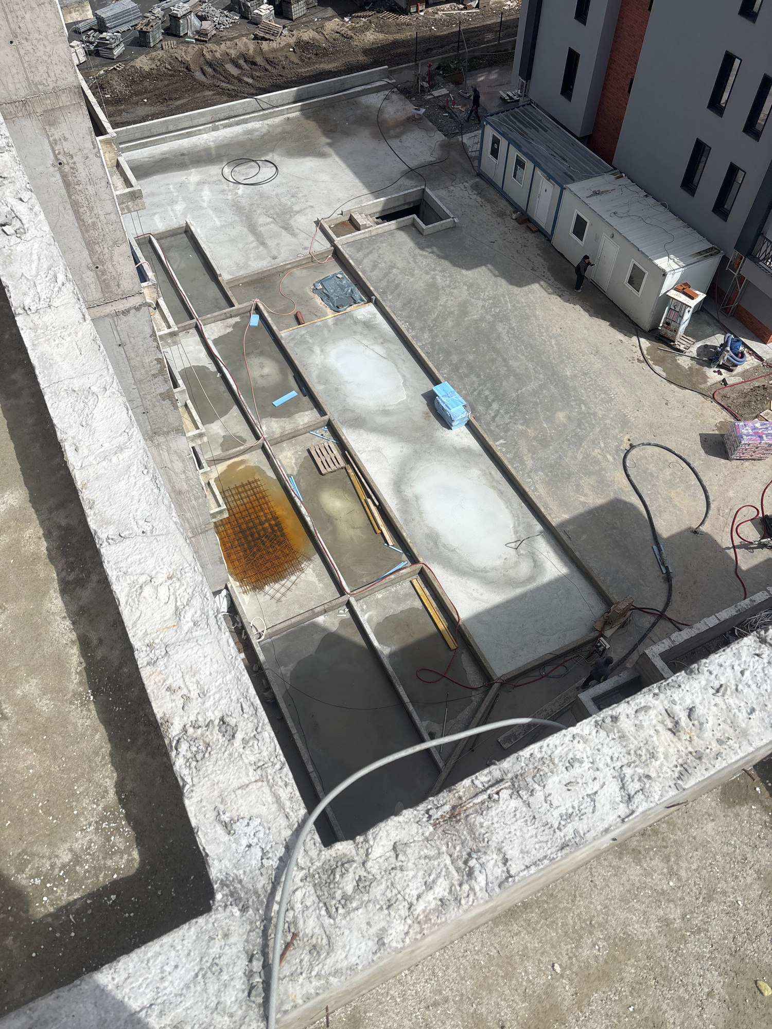 The image shows an elevated view of a construction site in Burgas, Bulgaria. A multi-story building is partially visible to the left. A modular structure, likely a construction office, is positioned a…read more