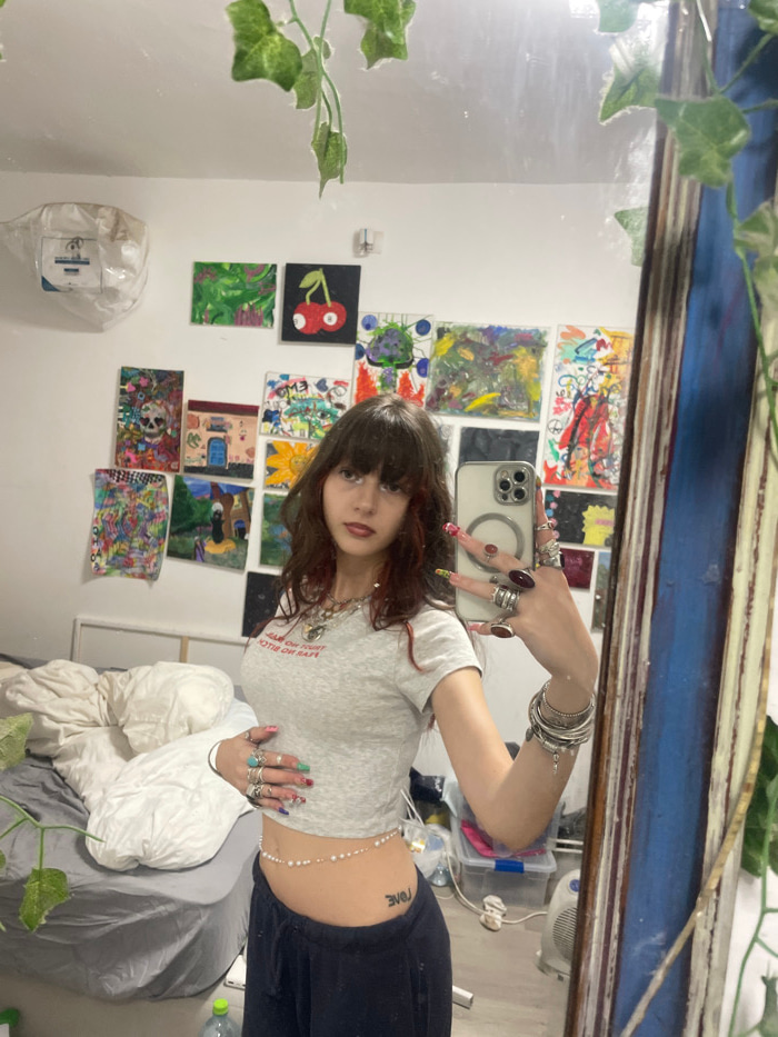 A female individual is depicted taking a mirror selfie within a residential room in Raanana, Israel. The subject has dark, layered hair with reddish undertones and bangs, a light complexion, and dark…read more