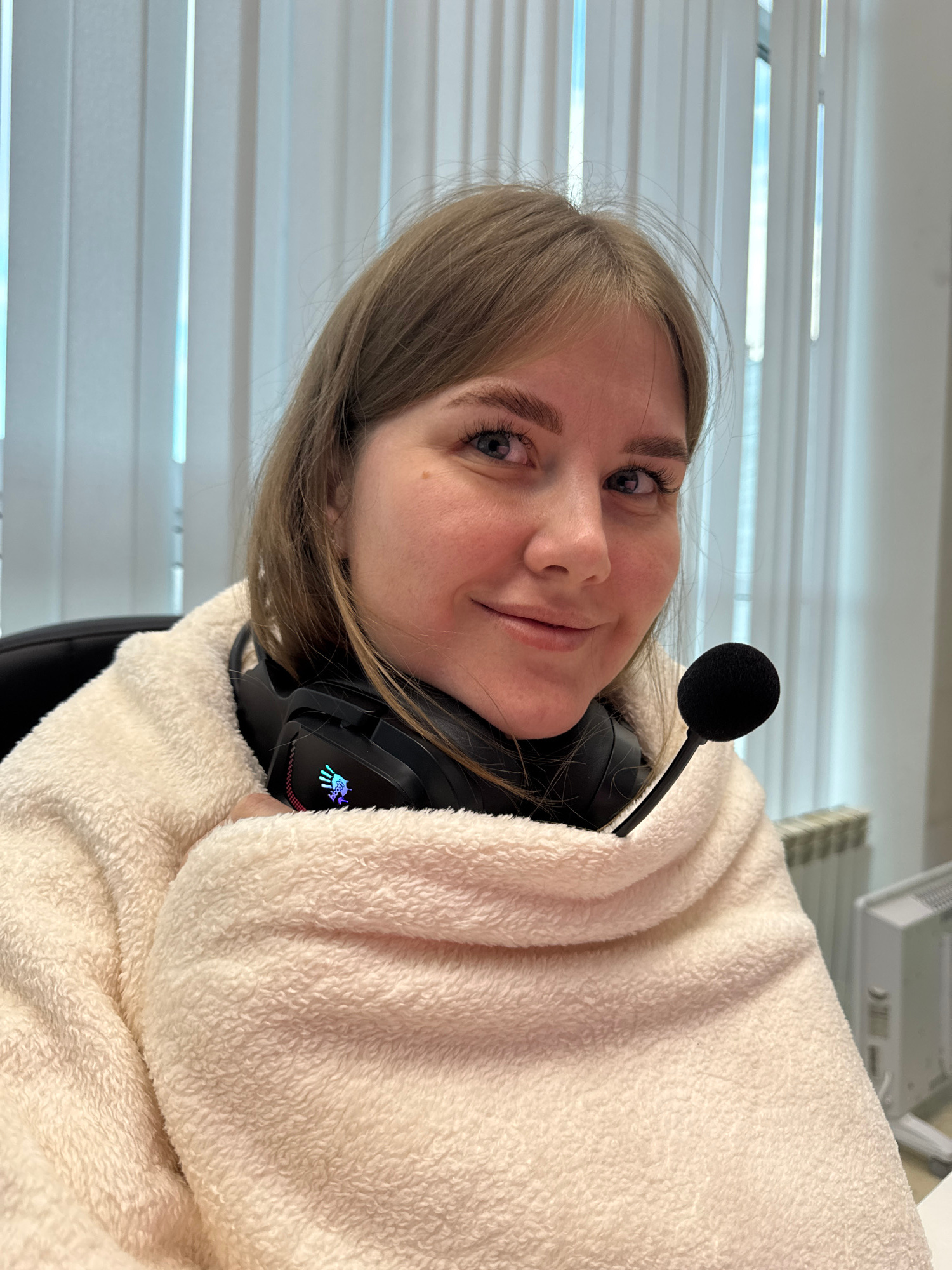 A fair-skinned woman with light brown hair is wrapped in a fluffy, light beige blanket. She is wearing black headphones with a microphone and a colorful logo on the earcups. The background consists of…read more