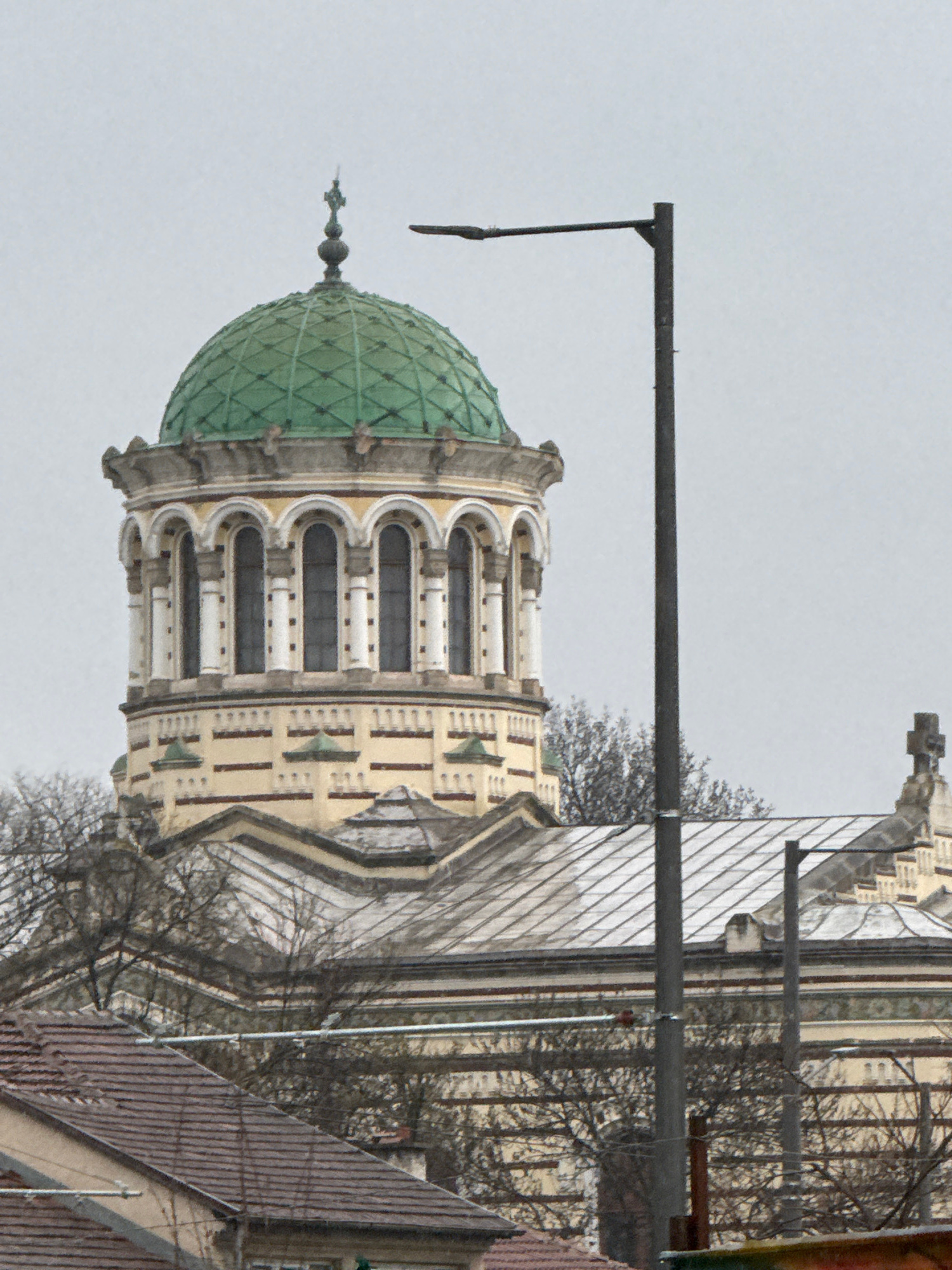 The image shows the dome of the Sofia Synagogue, located in Sofia, Bulgaria. The green, patterned dome sits atop a multi-tiered, ornate building section with arched windows. A streetlight pole with a…read more