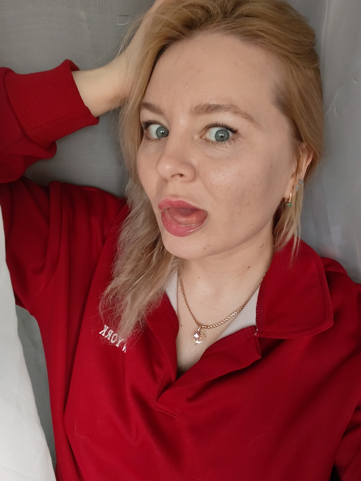 A light-skinned woman with blonde hair and blue eyes is visible in the image. She is wearing a red collared shirt with white lettering that is mirrored and illegible in the photo. She has her mouth op…read more