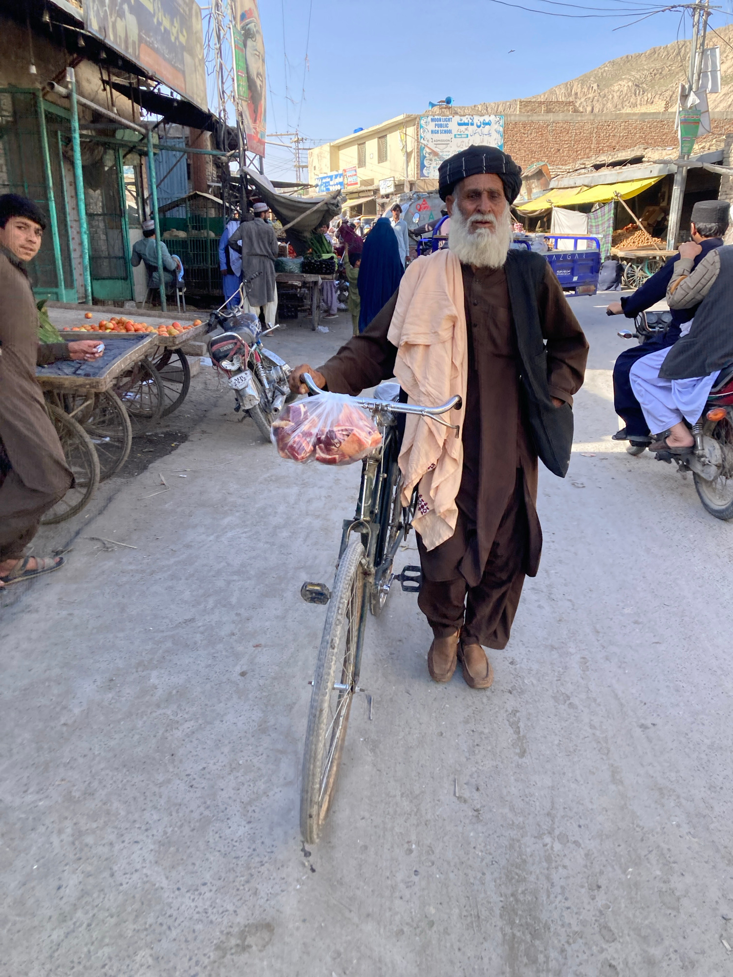A wide-angle photograph depicts a man in traditional attire standing next to a bicycle on a street in Quetta City Tehsil, Pakistan. The man wears a dark head covering, a long-sleeved brown shirt, brow…read more