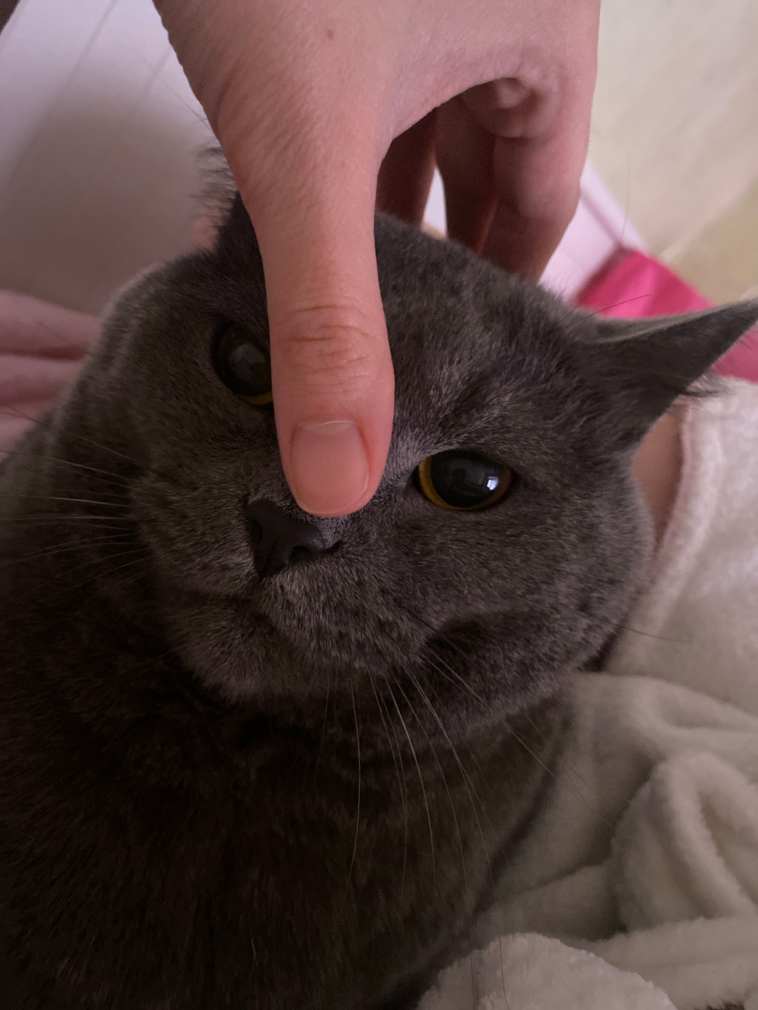 A close-up shot shows a gray cat being gently touched on its nose with a human finger. The cat has golden eyes and a black nose. The background is out of focus but appears to be soft material. The loc…read more
