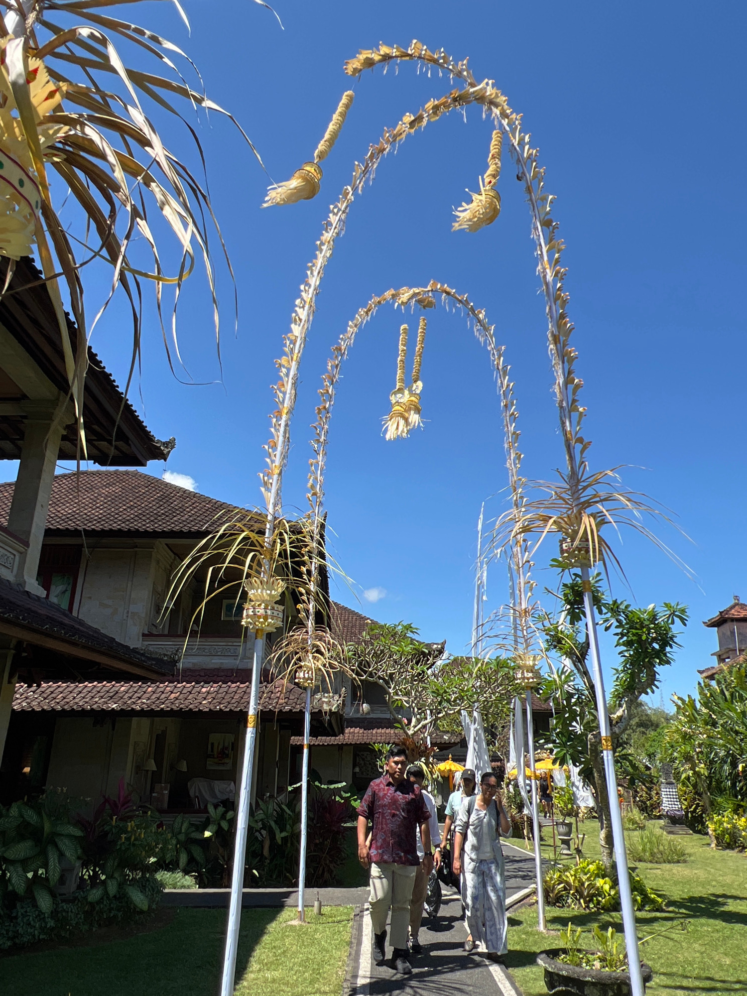 The image, taken in Ubud District, Indonesia, showcases a decorative arrangement against a clear blue sky. The arrangement appears to consist of curved poles adorned with dried plant materials and emb…read more