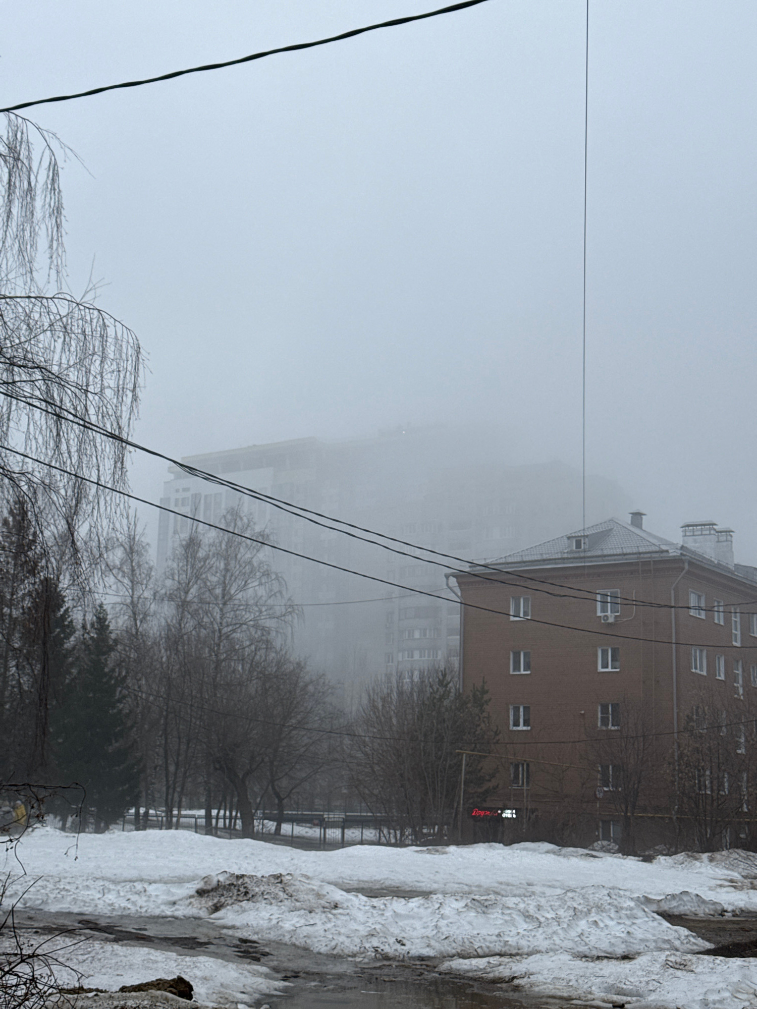 The image depicts a foggy street scene in Kazan, Russia, likely during winter. A multi-story brick building with white-framed windows is visible, partially obscured by the fog. Power lines traverse th…read more