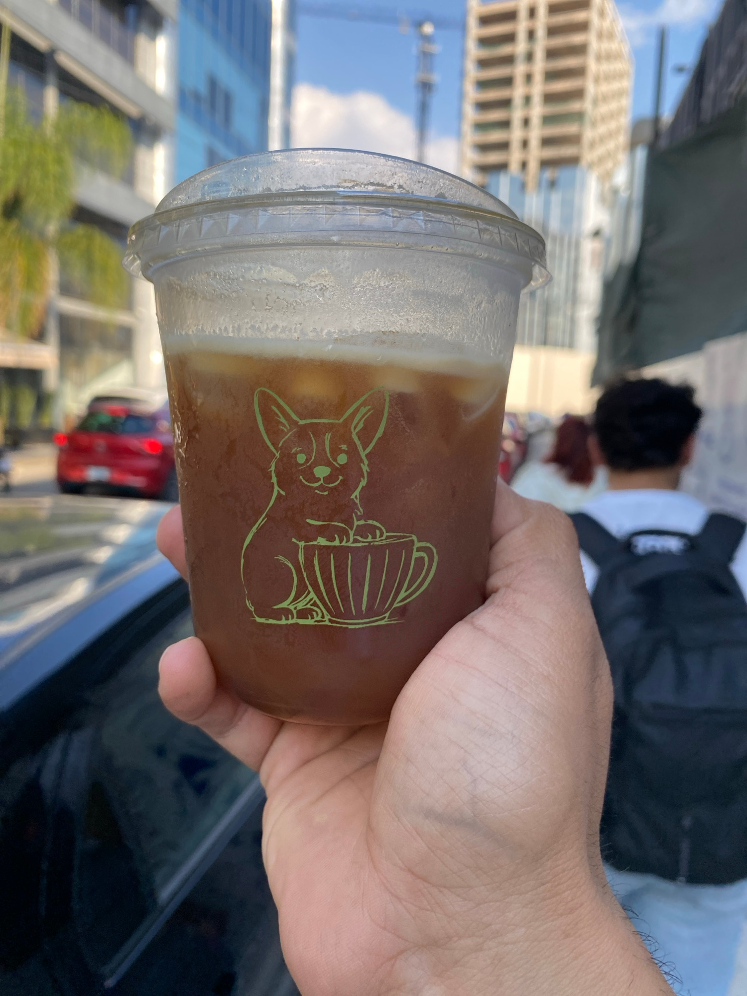 A hand holds a clear plastic cup filled with a brown beverage and a layer of white foam on top. The cup has a green cartoon drawing of a dog holding a mug on its side. The cup appears to be cold as co…read more