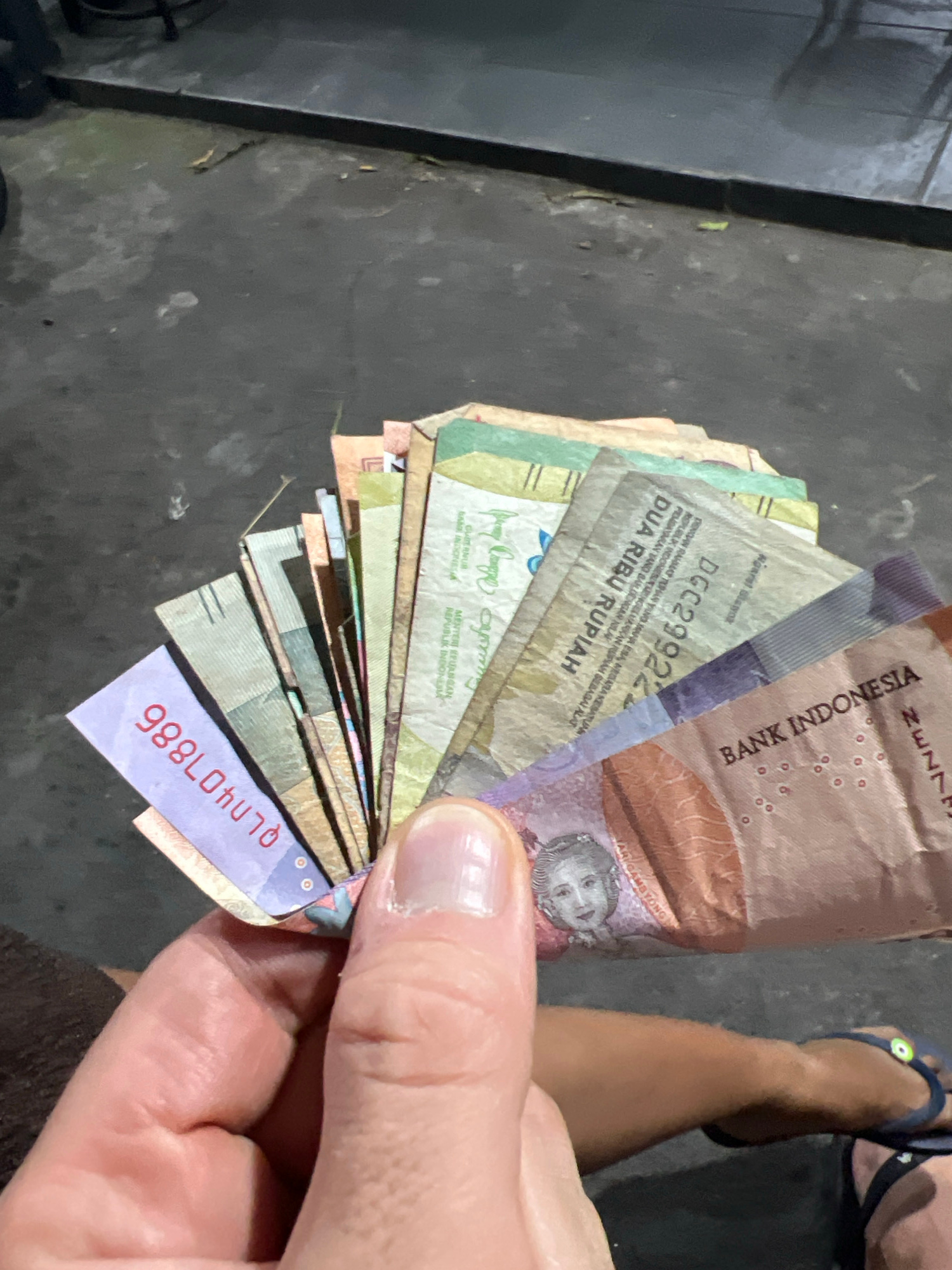 A hand holds a fan of Indonesian Rupiah banknotes. Currency denominations are visible, including one bill marked "DUA RIBU RUPIAH" (Two Thousand Rupiah). A glimpse of a person's leg and sandal is visi…read more