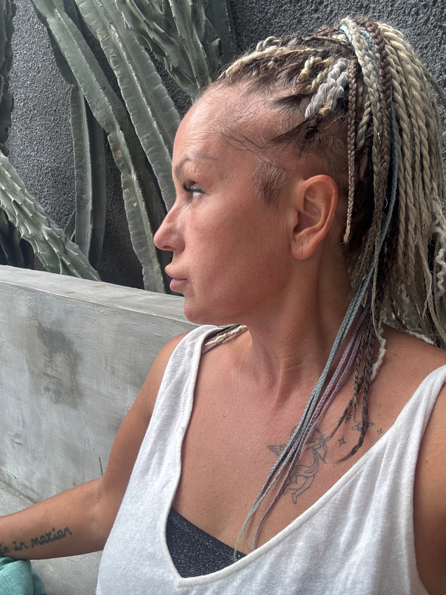 The image depicts a woman with light skin, blonde and brown braided hair, and tattoos on her chest and arm. She is wearing a white tank top and a dark-colored bra is visible underneath. She is looking…read more