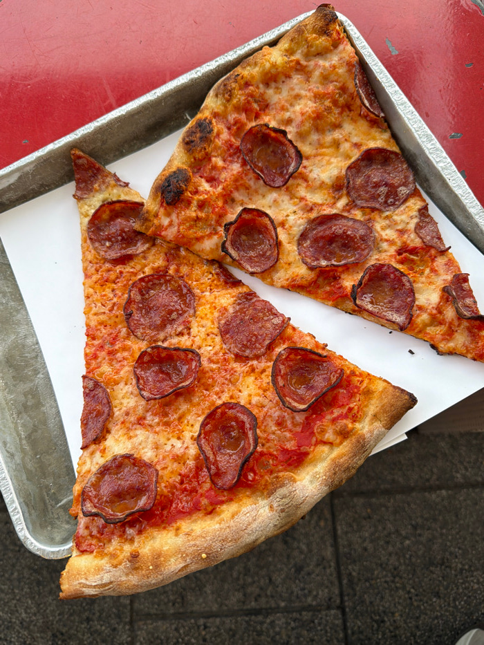 Two triangular slices of pepperoni pizza are presented on a sheet of white paper, which rests inside a rectangular metallic tray with raised edges. The pizza slices feature a red tomato sauce base, meβ¦read more