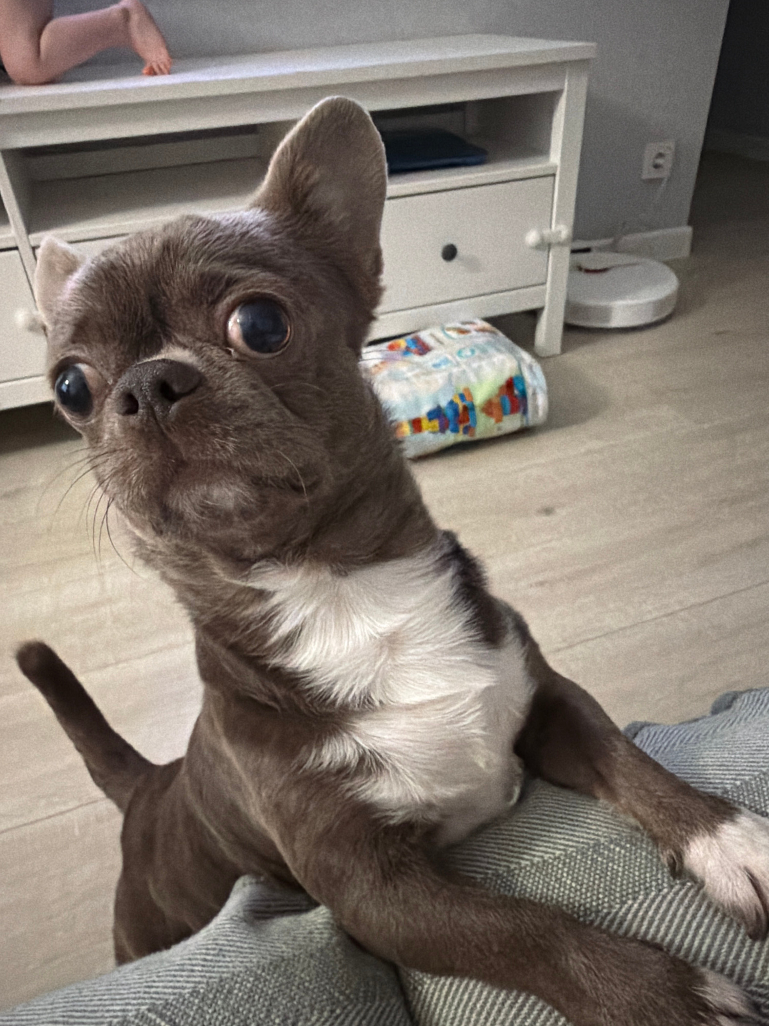 A dog is lying on a gray striped textile, with its front paws outstretched. The dog has gray fur with a white patch on its chest. Its face is close to the camera. The background includes a white cabin…read more