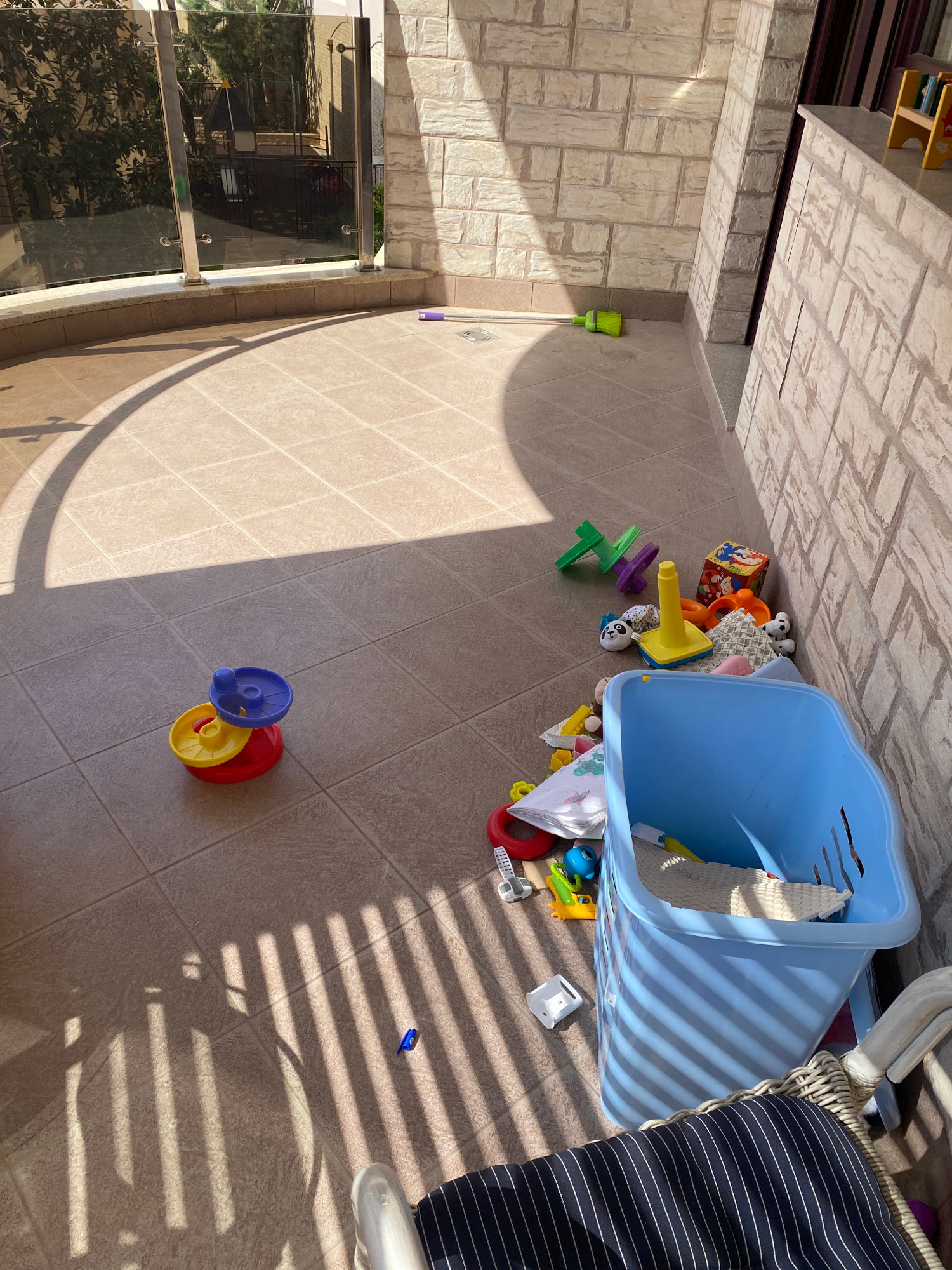 This image, taken in Bečići, Montenegro, captures a sunlit outdoor balcony or patio area with children's toys scattered across the tiled floor. No people are visible in the scene. The primary subject…read more