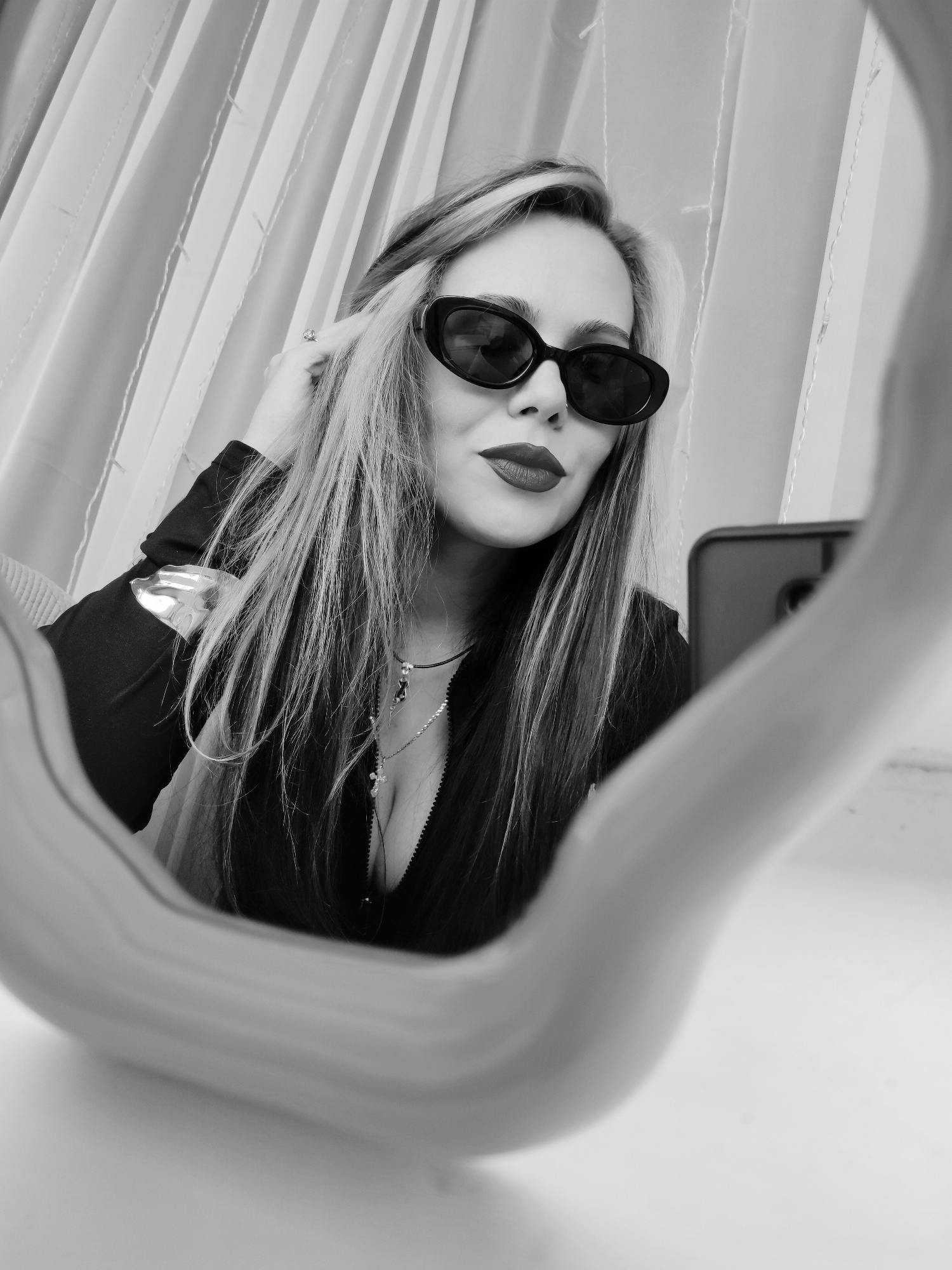 A monochrome, eye-level shot shows a woman reflected in a mirror. She is angled slightly toward the camera, wearing sunglasses and dark lipstick. She has long, straight hair with blonde streaks. She i…read more
