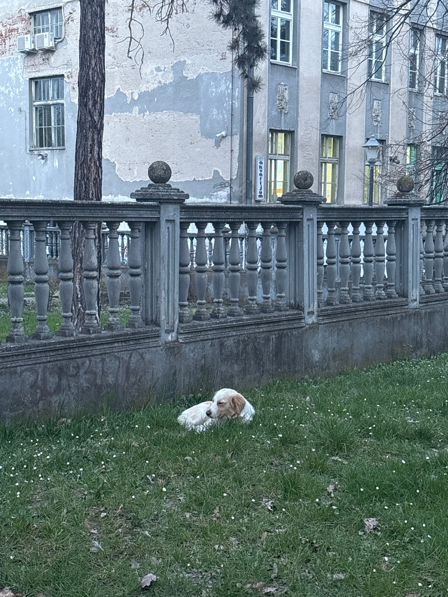 An outdoor scene in Kragujevac, Serbia, depicts a light-colored dog resting on a patch of grass in front of a weathered building. The dog, predominantly white with tan markings on its head and ears, i…read more