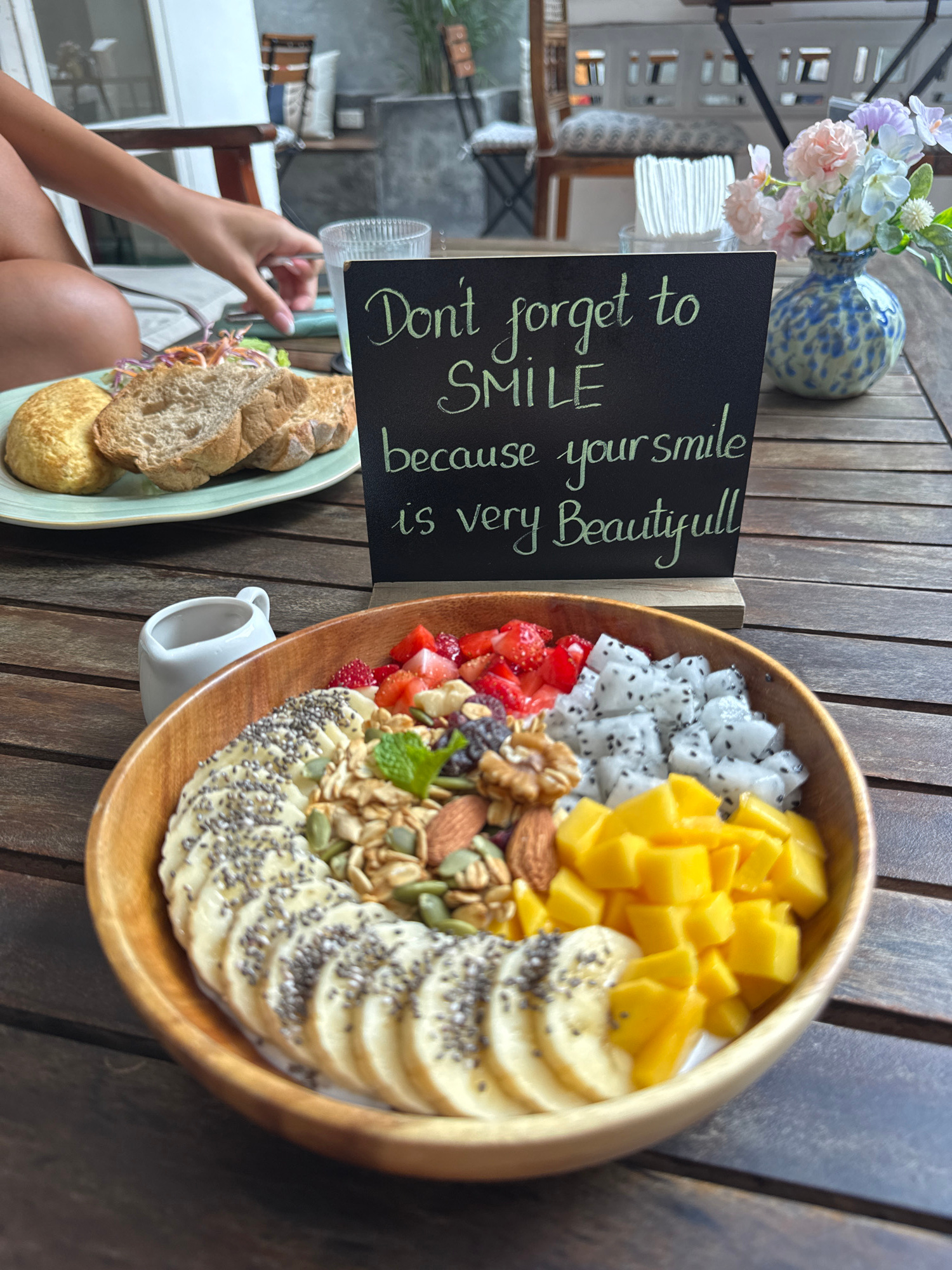 The image depicts a wooden table at an outdoor cafe. On the table are a wooden bowl filled with fruit, granola, and nuts, and a plate of bread with a side salad and a bread roll. A chalkboard sign is…read more