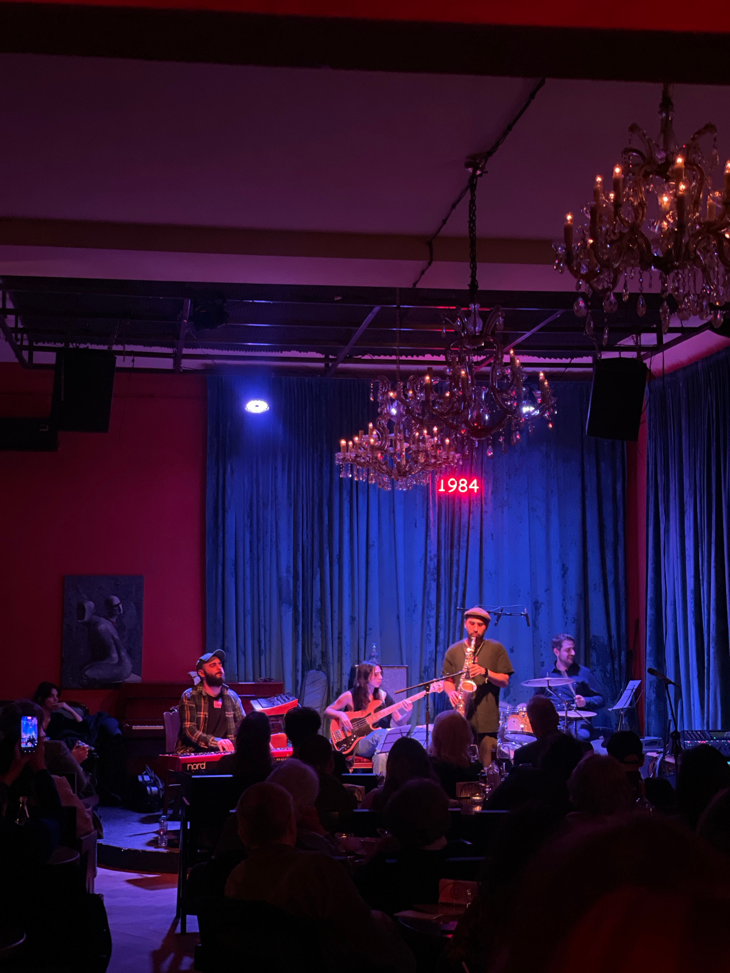 A jazz band performs on a stage in Tbilisi, Georgia. The stage is illuminated with blue and red lighting and features a backdrop of draped blue fabric. A red neon sign displays "1984". The band includ…read more