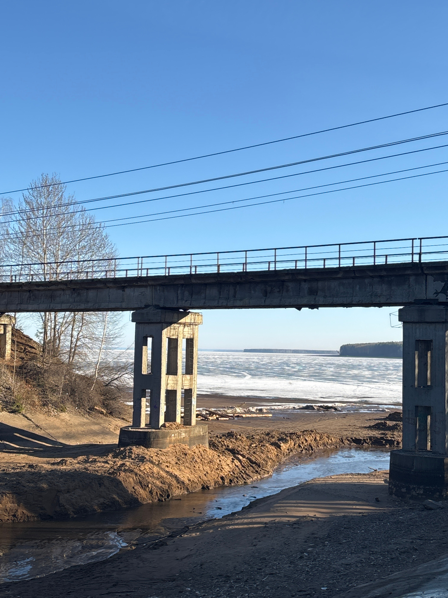 The image depicts a section of a concrete bridge structure with utility wires in the foreground. The view from underneath the bridge reveals a body of water with icy patches, possibly a river or lake.…read more