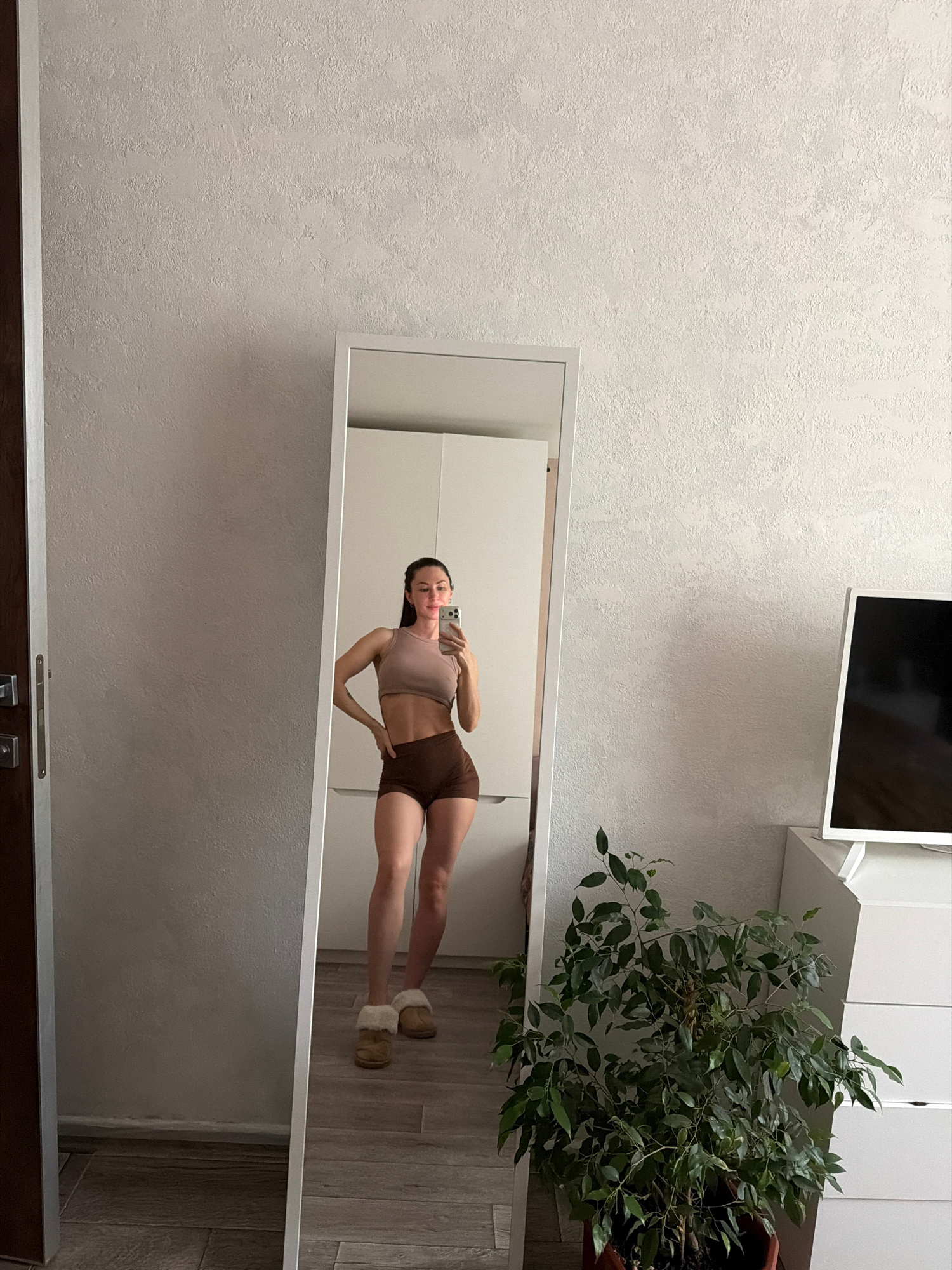 A young woman is taking a selfie in a full-length mirror. She is wearing a tan top and brown shorts with brown slippers. She is standing on a wooden floor with a white wall and white furniture in the…read more