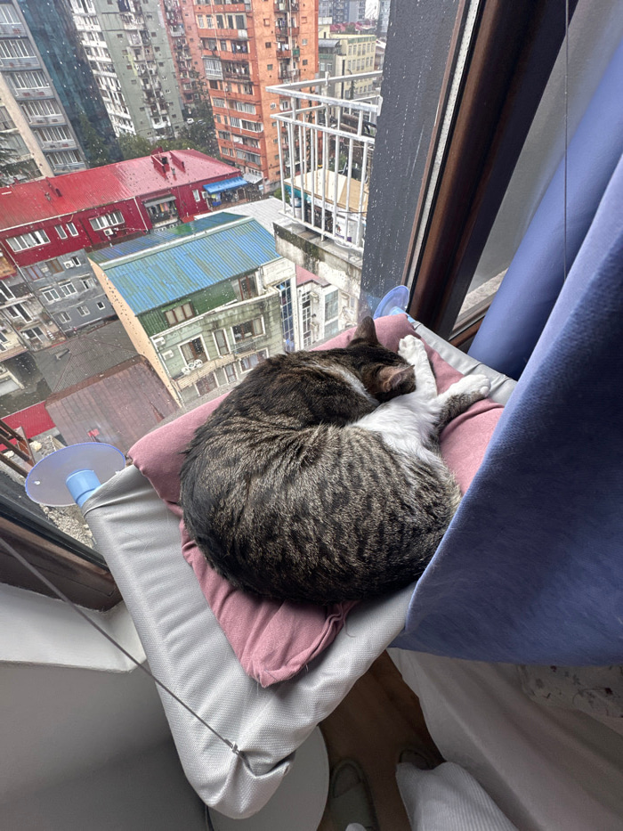 A domestic short-haired tabby cat, predominantly dark brown with distinctive stripes and white fur on its underside and paws, rests curled up in a sleeping position. The cat is situated on a small pin…read more