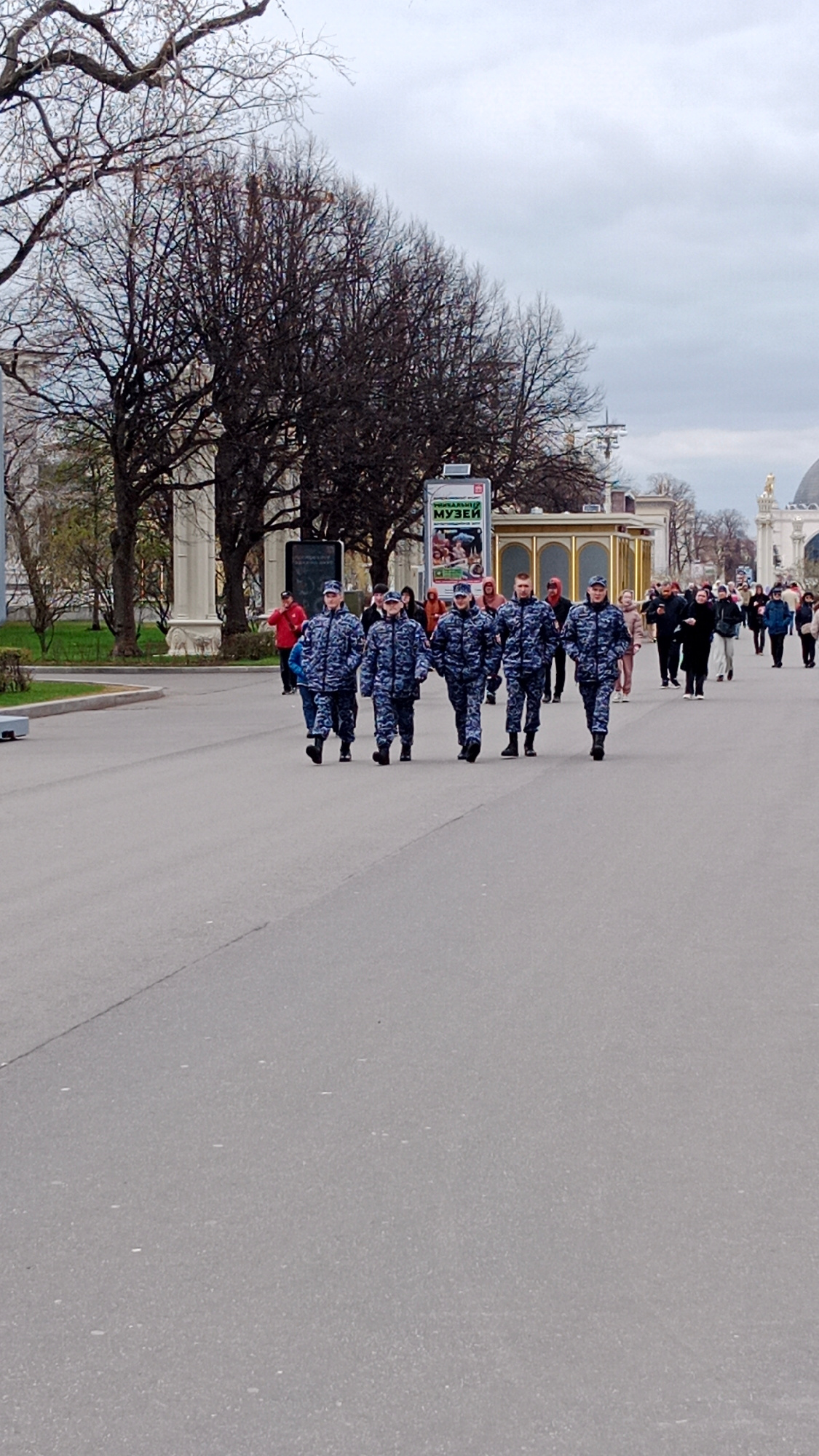 The image depicts a group of five individuals walking in a straight line on a wide paved road. They are wearing matching dark blue patterned uniforms and caps. Other people are walking in the backgrou…read more