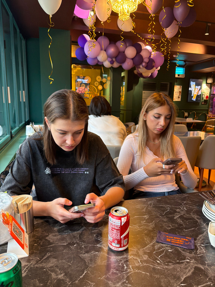 Two young adult females are seated at a dark marble-patterned table in an indoor restaurant or cafe setting, likely located in Seoul, South Korea, as indicated by Korean text on various items. Both in…read more