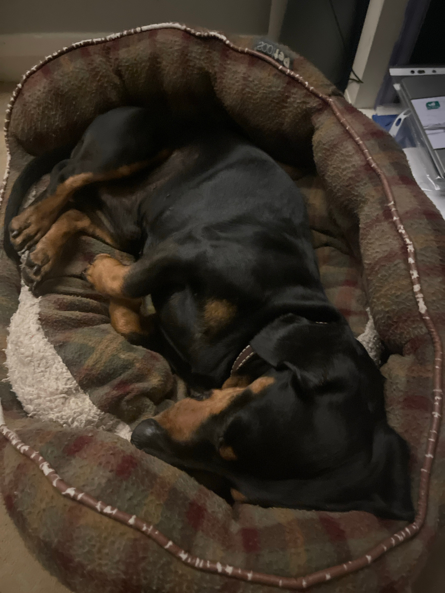 A black and tan dog, likely a dachshund or similar breed, is captured sleeping soundly in a plush dog bed. The dog is curled up tightly into a ball, with its head resting on the soft, cream-colored in…read more