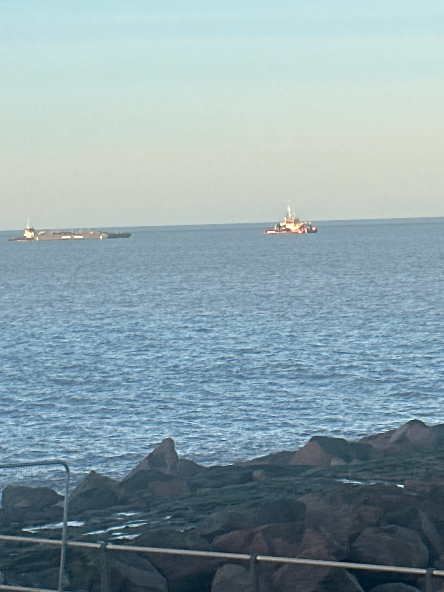This image shows a view from the coast in East Suffolk, United Kingdom, looking out over the water. In the distance, there are two ships. The foreground consists of rocky formations and parts of a met…read more