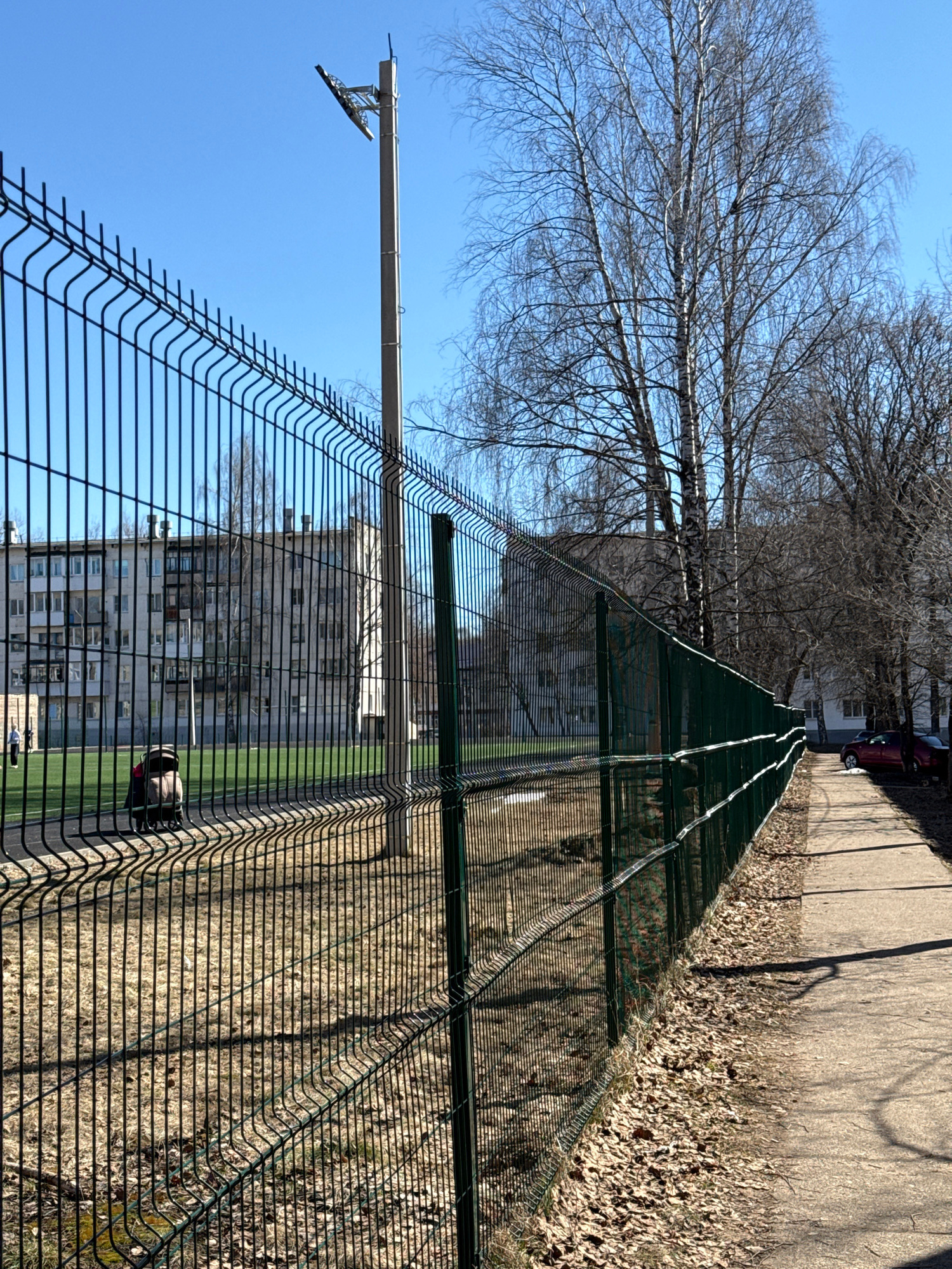 The image depicts a section of wire mesh fencing in Chaikovsky, Russia, bordering a pedestrian path. The fence, constructed with horizontal and vertical wire strands, is positioned between the path an…read more