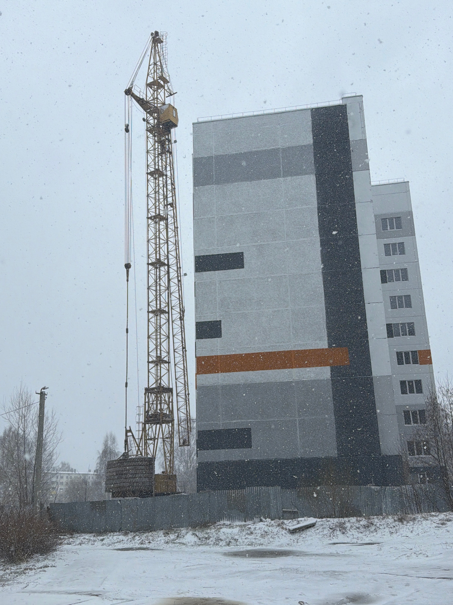 The image depicts a snowy, overcast scene in Chaikovsky, Russia. A construction crane is positioned in front of a multi-story building under construction. The building's facade is a mix of gray and da…read more