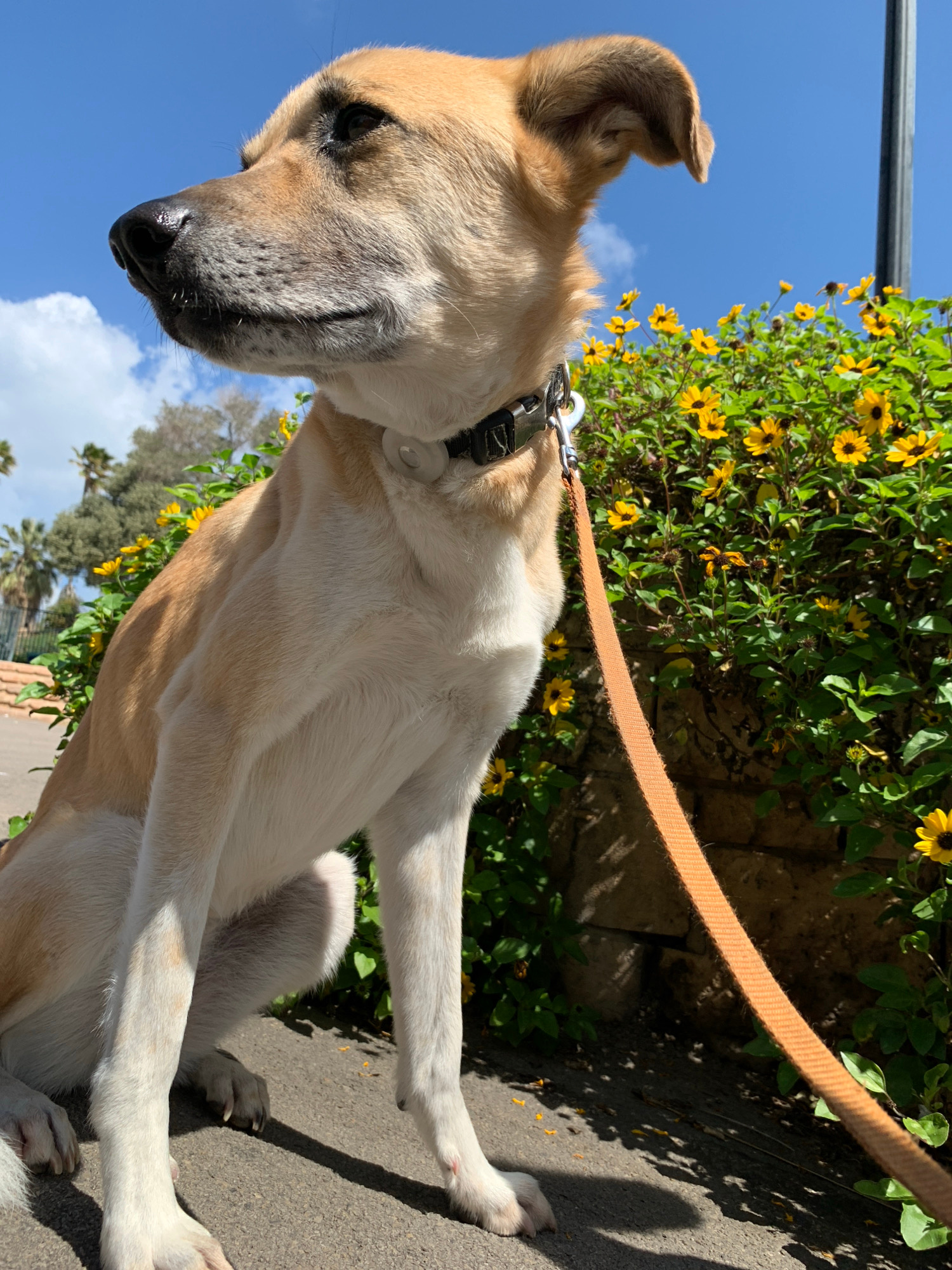 A low-angle shot depicts a medium-sized dog standing on a sidewalk. The dog has a tan and white coat and a black collar with a leash attached. The leash is tan and extends to the lower left of the fra…read more