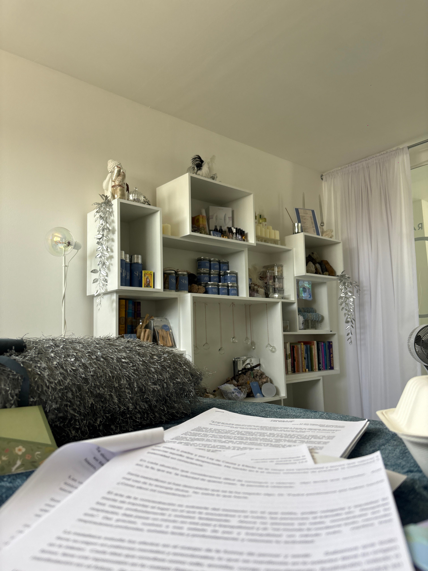 The photograph shows an interior scene with a focus on a white, modular shelving unit mounted on a light-colored wall. The shelves are filled with various objects, including books, candles, and decora…read more