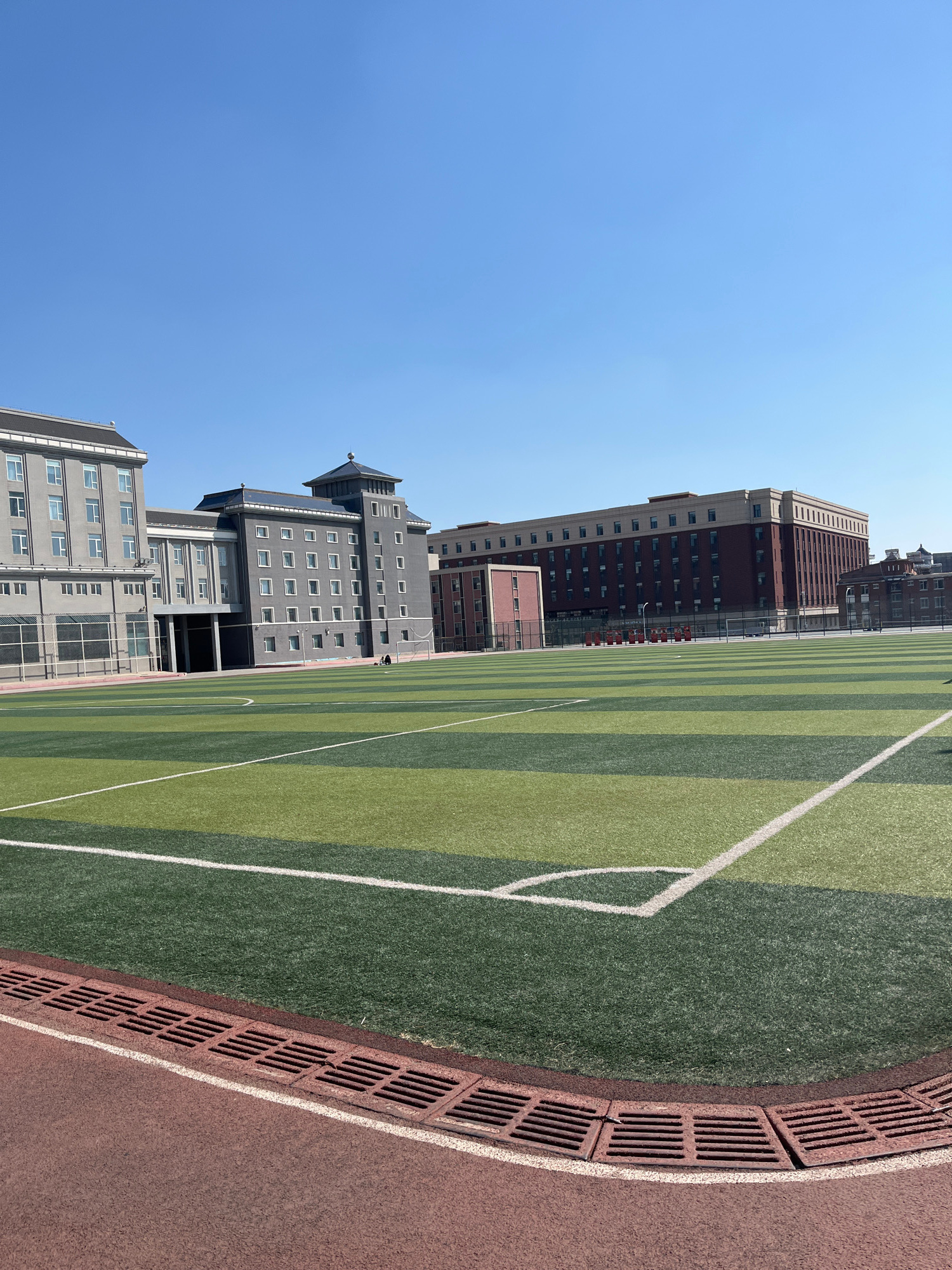 The image shows an outdoor scene in Changchun City, China, featuring a soccer field with alternating stripes of light and dark green artificial turf. White lines mark the boundaries of the field. Adja…read more