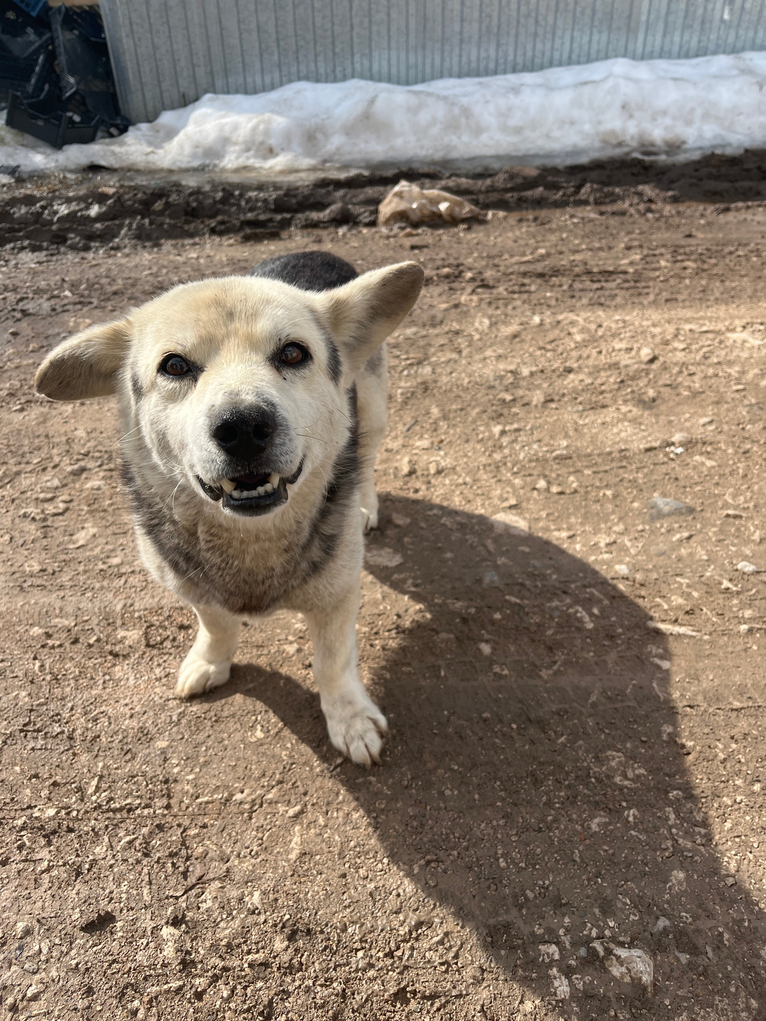 The image shows a medium-sized dog with primarily light grey and white fur and dark grey markings on its back. The dog is standing on a dirt or gravel surface, casting a shadow to the right. Some snow…read more