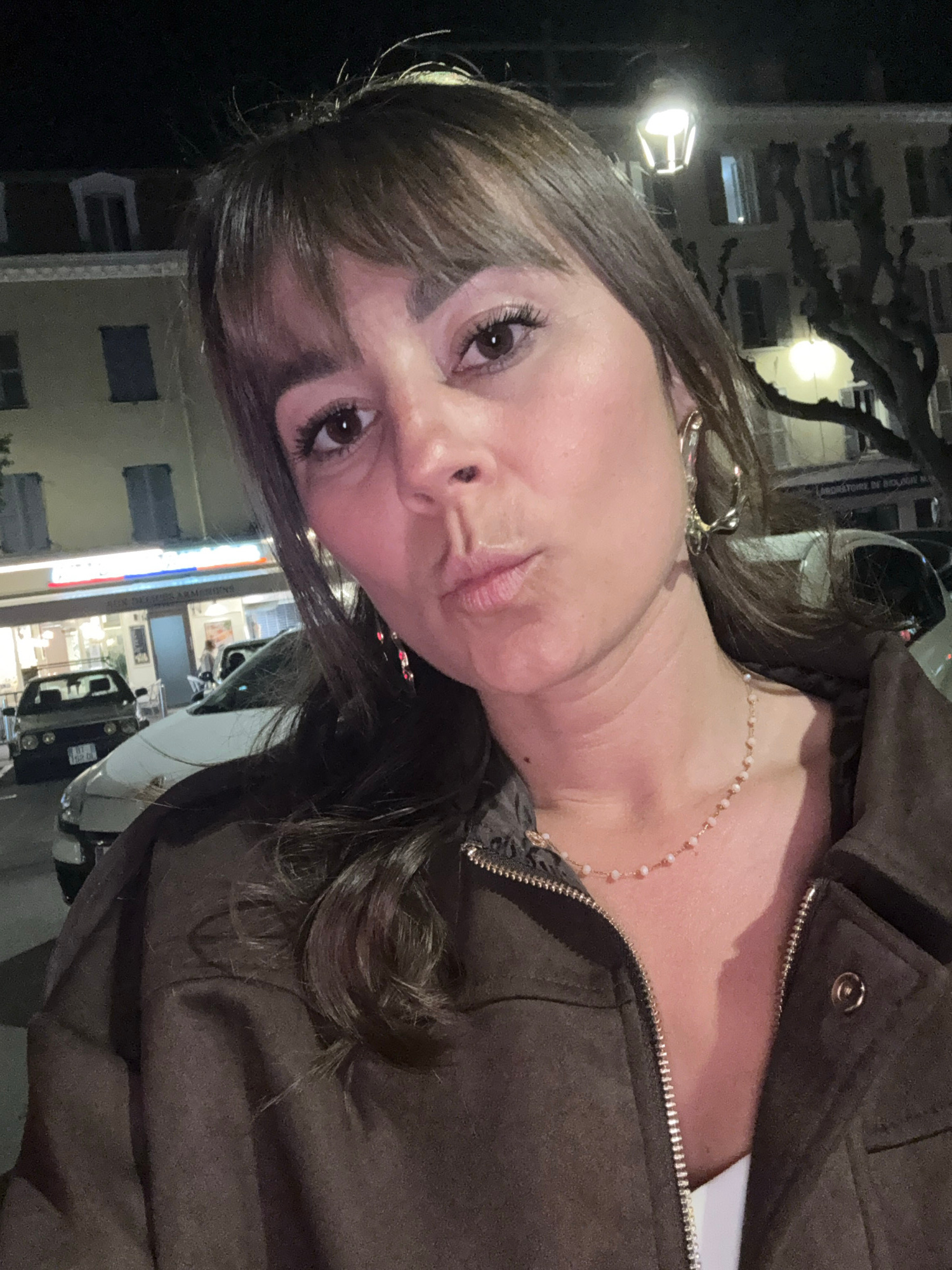 A person with medium-length brown hair and bangs is standing outside at night in what appears to be Cannes, France, based on the signage in the background. The person is wearing a dark brown jacket an…read more
