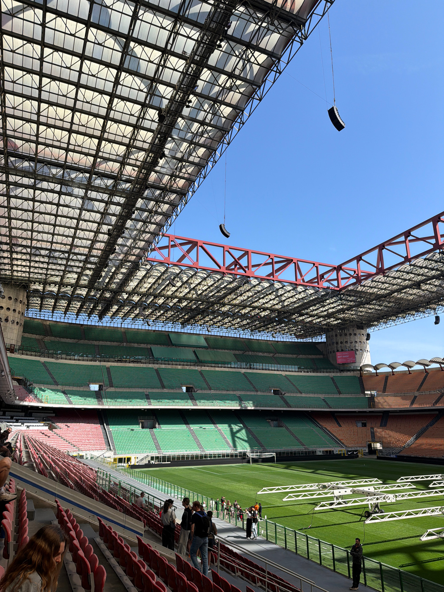 This image shows the San Siro stadium in Milan, Italy, during what appears to be preparations for an event. A large scaffolding structure and a red crane are visible on the left side of the frame, rea…read more