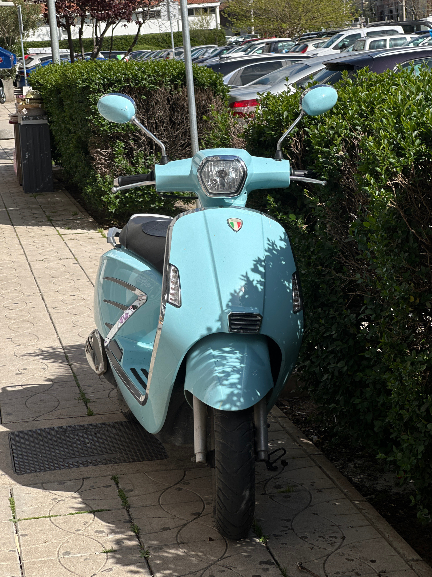 A light blue moped is parked on a patterned sidewalk in Šušanj, Montenegro. Green shrubs surround the moped. Cars are parked in the background.