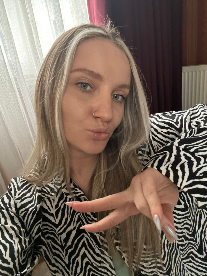 The image depicts a female subject indoors, in an interior setting identified by the prompt as located within Esenyurt, Turkey. She is positioned for a frontal view, with long blonde hair displaying p…read more