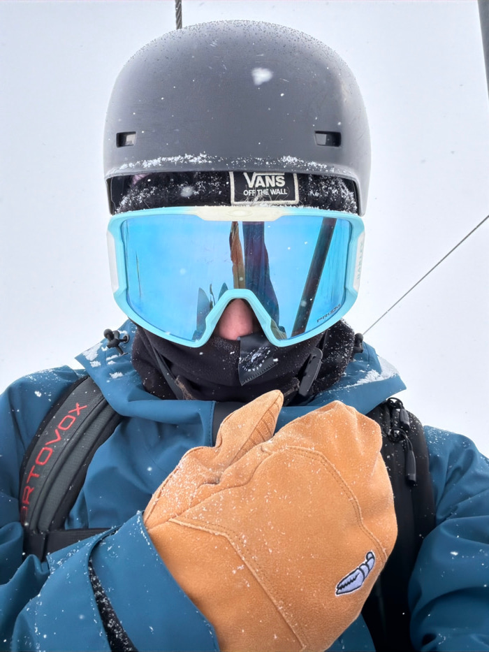 A skier or snowboarder wears a gray helmet with a "Vans Off The Wall" sticker and blue-tinted goggles. The goggles reflect the surroundings. The person wears a blue jacket and a tan glove with a claw…read more