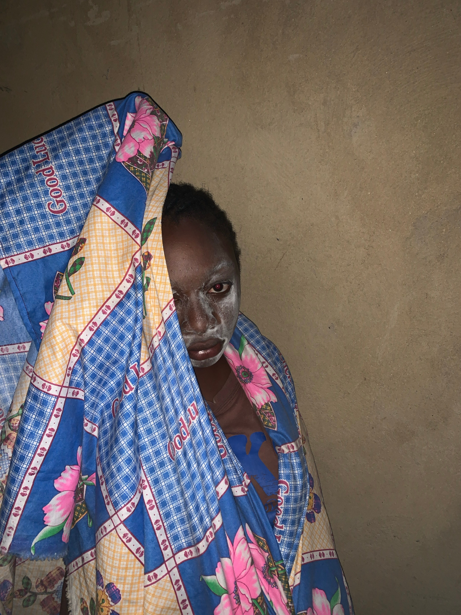 A close-up, indoor shot depicts a person lying under a blue, yellow, and pink floral patterned blanket. The person's face is visible, and they appear to have a white substance on their face. The backg…read more