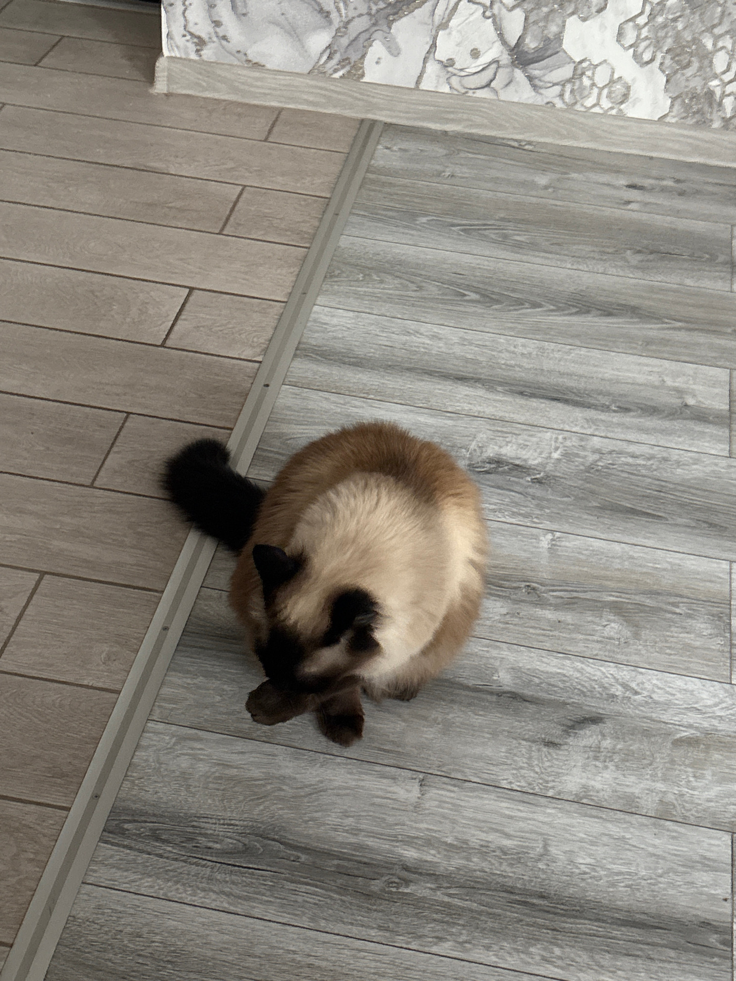 A tan and brown Siamese cat is curled up on a gray wooden floor. The cat's head is tucked towards its paws, and its dark tail is extended. A gray metal strip is running along the floor. Part of a patt…read more