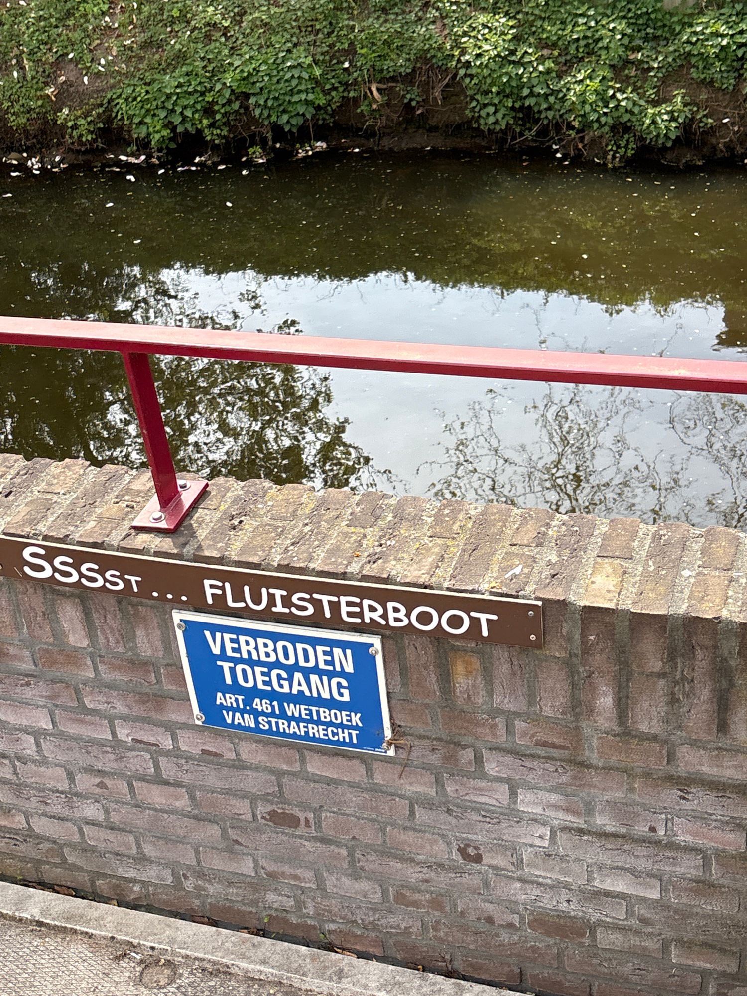 The image shows a canal in Veghel, Netherlands. A red metal handrail is visible in the foreground, attached to a brick wall. Two signs are mounted on the wall: a brown sign reading "Ssssst... FLUISTER…read more