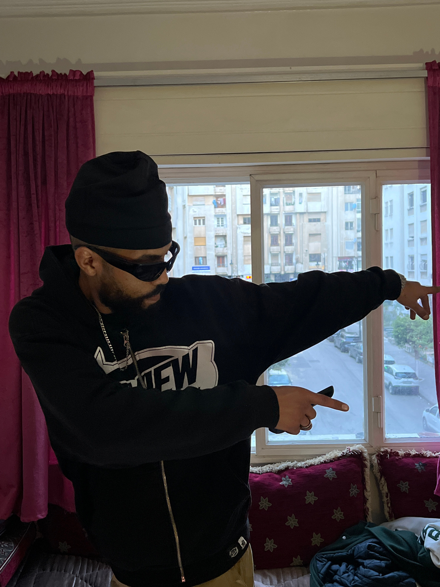 A man wearing a black beanie, sunglasses, and a black hoodie with white lettering is posing in front of a window. He is holding up two fingers on each hand, with the window showing a cityscape beyond.…read more