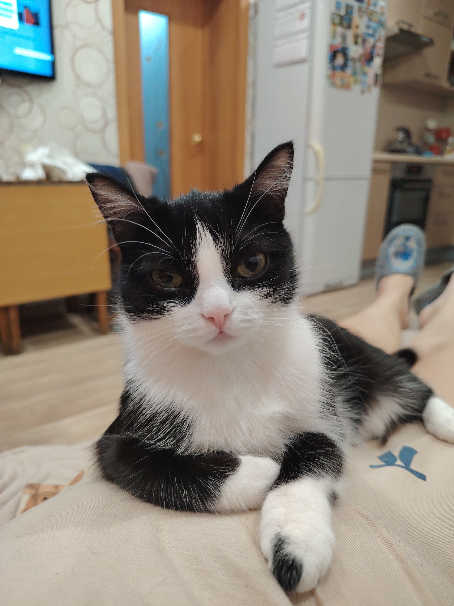 A black and white cat is lying on someone's lap in an indoor setting. The cat is predominantly white on its chest and paws, with black fur on its head and back. The cat is positioned towards the camer…read more