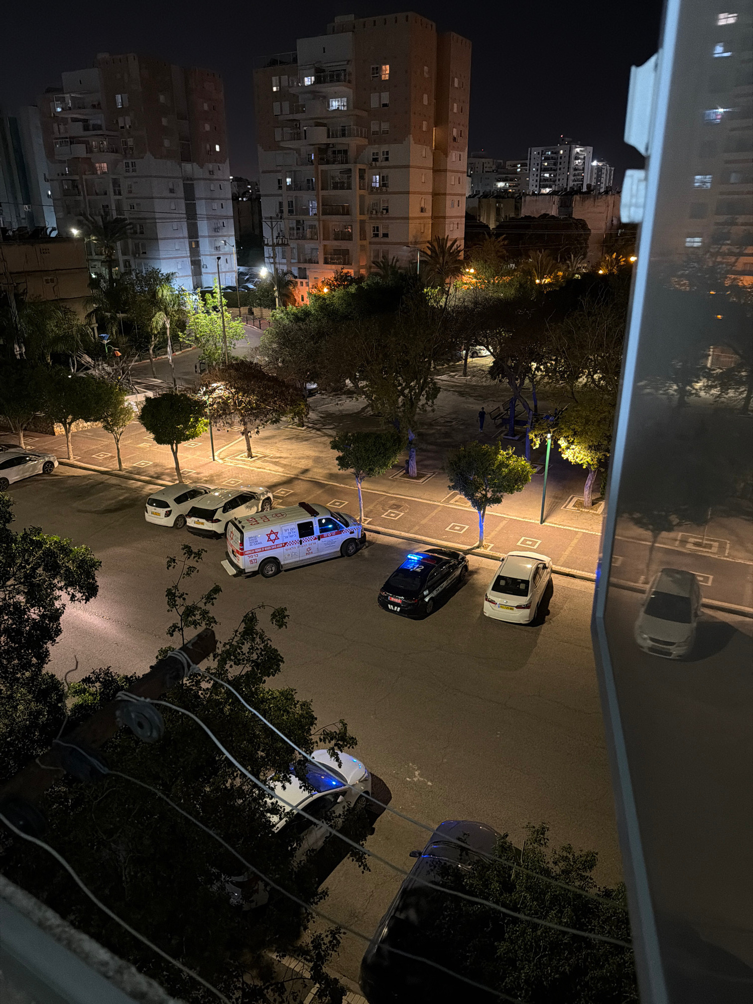 An elevated night-time view captures an urban street scene in Kiryat Bialik, Israel, featuring emergency vehicles. The image is taken from a building, looking down onto a paved road lined with trees a…read more